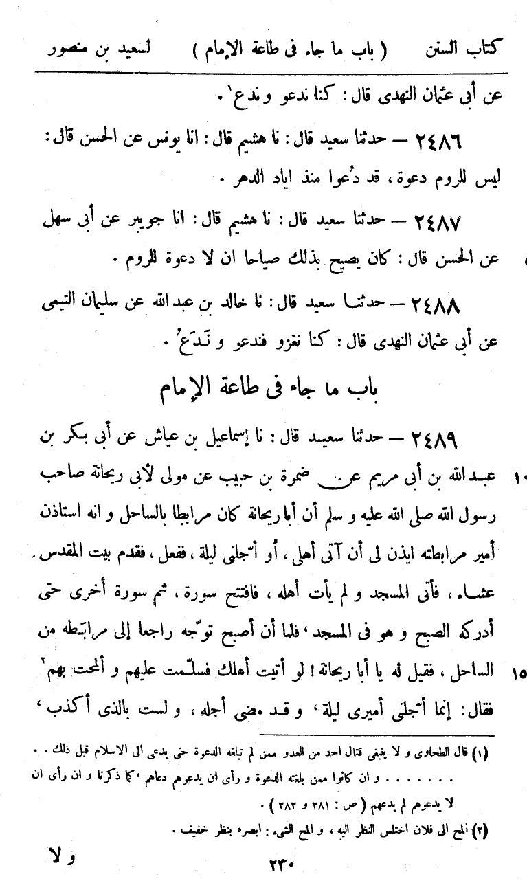 2487 - حَدَّثَنَا سَعِيدٌ قَالَ: نا هُشَيْمٌ، قَالَ: أنا جُوَيْبِرٌ، عَنْ أَبِي سَهْلٍ، عَنِ الْحَسَنِ، قَالَ: كَانَ يَصِيحُ بِذَلِكَ صِيَاحًا «§أَنْ لَا دَعْوَةَ لِلرُّومِ»