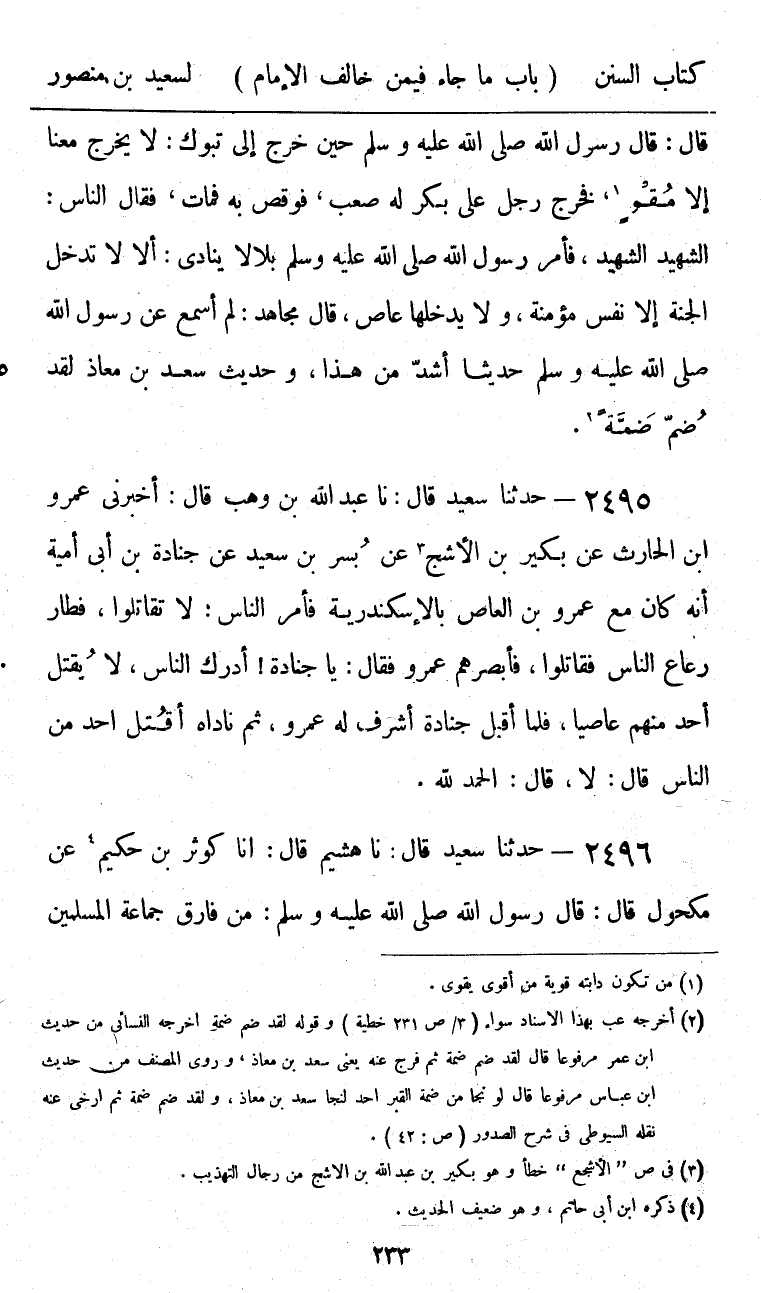 2496 - حَدَّثَنَا سَعِيدٌ قَالَ: نا هُشَيْمٌ، قَالَ: أنا كَوْثَرُ بْنُ حَكِيمٍ، عَنْ مَكْحُولٍ، قَالَ: قَالَ رَسُولُ اللَّهِ صَلَّى اللهُ عَلَيْهِ وَسَلَّمَ: «§مَنْ فَارَقَ جَمَاعَةَ الْمُسْلِمِينَ -[234]- فَلَا صَلَاةَ لَهُ حَتَّى يَرْجِعَ إِلَيْهِمْ، وَلَا لِعَاصِي ثَغْرٍ مِنْ ثُغُورِ الْمُسْلِمِينَ حَتَّى يَرْجِعَ إِلَى ثَغْرِهِ»