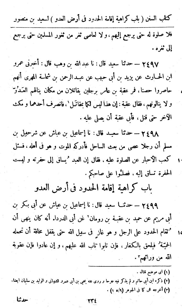 2497 - حَدَّثَنَا سَعِيدٌ قَالَ: نا عَبْدُ اللَّهِ بْنُ وَهْبٍ، قَالَ: أَخْبَرَنِي عَمْرُو بْنُ الْحَارِثِ، عَنْ يَزِيدَ بْنِ أَبِي حَبِيبٍ، عَنْ عَبْدِ الرَّحْمَنِ بْنِ شِمَاسَةَ الْمَهْرِيِّ، أَنَّهُمْ حَاصَرُوا حِصْنًا فَمَرَّ عُقْبَةُ بْنُ عَامِرٍ بِرَجُلَيْنِ يُقَاتِلَانِ مِنْ مَكَانٍ يَنَالُهُمُ الْعَدُوُّ وَلَا يَنَالُونَهُمْ، فَقَالَ عُقْبَةُ: «إِنَّ §هَذَا لَيْسَ لَكُمَا بِمُقَاتَلٍ» فَانْصَرَفَ أَحَدُهُمَا، وَمَكَثَ الْآخَرُ حَتَّى قُتِلَ، فَأَبَى عُقْبَةُ أَنْ يُصَلِّيَ عَلَيْهِ