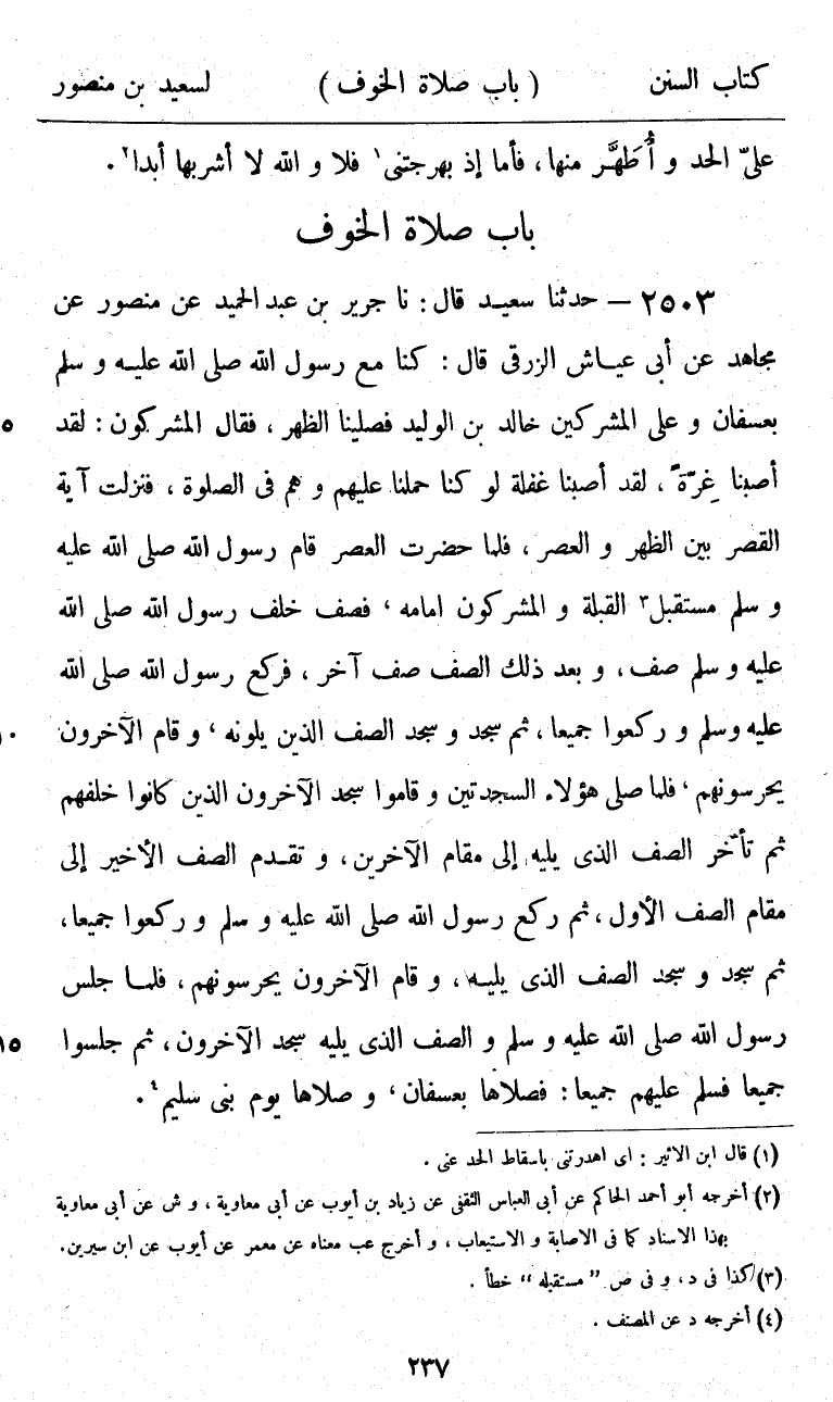 2503 - حَدَّثَنَا سَعِيدٌ قَالَ: نا جَرِيرُ بْنُ عَبْدِ الْحَمِيدِ، عَنْ مَنْصُورٍ، عَنْ مُجَاهِدٍ، عَنْ أَبِي عَيَّاشٍ الزُّرَقِيِّ، قَالَ: " كُنَّا مَعَ رَسُولِ اللَّهِ صَلَّى اللهُ عَلَيْهِ وَسَلَّمَ بِعُسْفَانَ، وَعَلَى الْمُشْرِكِينَ خَالِدُ بْنُ الْوَلِيدِ فَصَلَّيْنَا الظُّهْرَ، فَقَالَ الْمُشْرِكُونَ: لَقَدْ أَصَبْنَا غِرَّةً، لَقَدْ أَصَبْنَا غَفْلَةً , لَوْ كُنَّا حَمَلْنَا عَلَيْهِمْ وَهُمْ فِي الصَّلَاةِ فَنَزَلَتْ آيَةُ الْقَصْرِ بَيْنَ الظُّهْرِ وَالْعَصْرِ، فَلَمَّا حَضَرَتِ الْعَصْرُ §قَامَ رَسُولُ اللَّهِ صَلَّى اللهُ عَلَيْهِ وَسَلَّمَ مُسْتَقْبِلَ الْقِبْلَةِ، وَالْمُشْرِكُونَ أَمَامَهُ، فَصَفَّ خَلْفَ رَسُولِ اللَّهِ صَلَّى اللهُ عَلَيْهِ وَسَلَّمَ صَفٌّ، وَبَعْدَ ذَلِكَ الصَّفِّ صَفٌّ آخَرُ، فَرَكَعَ رَسُولُ اللَّهِ صَلَّى اللهُ عَلَيْهِ وَسَلَّمَ وَرَكَعُوا جَمِيعًا، ثُمَّ سَجَدَ وَسَجَدَ الصَّفُّ الَّذِينَ يَلُونَهُ، وَقَامَ الْآخَرُونَ يَحْرُسُونَهُمْ، فَلَمَّا صَلَّى هَؤُلَاءِ السَّجْدَتَيْنِ وَقَامُوا سَجَدَ الْآخَرُونَ الَّذِينَ كَانُوا خَلْفَهُمْ، ثُمَّ تَأَخَّرَ الصَّفُّ الَّذِي يَلِيهِ إِلَى مَقَامِ الْآخَرِينَ، وَتَقَدَّمَ الصَّفُّ الْأَخِيرُ إِلَى مَقَامِ الصَّفِّ الْأَوَّلِ، ثُمَّ رَكَعَ رَسُولُ اللَّهِ صَلَّى اللهُ عَلَيْهِ وَسَلَّمَ وَرَكَعُوا جَمِيعًا، ثُمَّ سَجَدَ وَسَجَدَ الصَّفُّ الَّذِي يَلِيهِ، وَقَامَ الْآخَرُونَ يَحْرُسُونَهُمْ، فَلَمَّا جَلَسَ رَسُولُ اللَّهِ صَلَّى اللهُ عَلَيْهِ وَسَلَّمَ وَالصَّفُّ الَّذِي يَلِيهِ سَجَدَ الْآخَرُونَ، ثُمَّ جَلَسُوا جَمِيعًا فَسَلَّمَ عَلَيْهِمْ جَمِيعًا: فَصَلَّاهَا بِعُسْفَانَ، وَصَلَّاهَا يَوْمَ بَنِي سُلَيْمٍ "