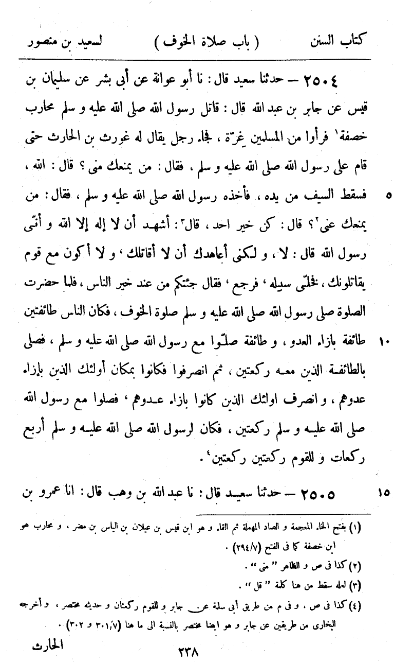 2504 - حَدَّثَنَا سَعِيدٌ قَالَ: نا أَبُو عَوَانَةَ، عَنْ أَبِي بِشْرٍ، عَنْ سُلَيْمَانَ بْنِ قَيْسٍ، عَنْ جَابِرِ بْنِ عَبْدِ اللَّهِ، قَالَ: قَاتَلَ رَسُولُ اللَّهِ صَلَّى اللهُ عَلَيْهِ وَسَلَّمَ مُحَارِبَ خَصَفَةَ، فَرَأَوْا مِنَ الْمُسْلِمِينَ غِرَّةً، فَجَاءَ رَجُلٌ يُقَالُ لَهُ غَوْرَثُ بْنُ الْحَارِثِ حَتَّى قَامَ عَلَى رَسُولِ اللَّهِ صَلَّى اللهُ عَلَيْهِ وَسَلَّمَ، فَقَالَ: " مَنْ يَمْنَعُكَ مِنِّي؟ قَالَ: «اللَّهُ» فَسَقَطَ السَّيْفُ مِنْ يَدِهِ، فَأَخَذَهُ رَسُولُ اللَّهِ صَلَّى اللهُ عَلَيْهِ وَسَلَّمَ، فَقَالَ: «§مَنْ يَمْنَعُكَ عَنِّي؟» قَالَ: كُنْ خَيْرَ آخِذٍ، قَالَ: «اشْهَدْ أَنْ لَا إِلَهَ إِلَّا اللَّهُ وَأَنِّي رَسُولُ اللَّهِ» قَالَ: لَا، وَلَكِنِّي أُعَاهِدُكَ أَنْ لَا أُقَاتِلَكَ، وَلَا أَكُونُ مَعَ قَوْمٍ يُقَاتِلُونَكَ، فَخَلَّى سَبِيلَهُ، فَرَجَعَ، فَقَالَ: جِئْتُكُمْ مِنْ عِنْدِ خَيْرِ النَّاسِ، فَلَمَّا حَضَرَتِ الصَّلَاةُ صَلَّى رَسُولُ اللَّهِ صَلَّى اللهُ عَلَيْهِ وَسَلَّمَ صَلَاةَ الْخَوْفِ، فَكَانَ النَّاسُ طَائِفَتَيْنِ: طَائِفَةٌ بِإِزَاءِ الْعَدُوِّ، وَطَائِفَةٌ صَلَّوْا مَعَ رَسُولِ اللَّهِ صَلَّى اللهُ عَلَيْهِ وَسَلَّمَ، فَصَلَّى بِالطَّائِفَةِ الَّذِينَ مَعَهُ رَكْعَتَيْنِ، ثُمَّ انْصَرَفُوا، فَكَانُوا بِمَكَانِ أُولَئِكَ الَّذِينَ بِإِزَاءِ عَدُوِّهِمْ، وَانْصَرَفَ أُولَئِكَ الَّذِينَ كَانُوا بِإِزَاءِ عَدُوِّهِمْ، فَصَلَّوْا مَعَ رَسُولِ اللَّهِ صَلَّى اللهُ عَلَيْهِ وَسَلَّمَ رَكْعَتَيْنِ، فَكَانَ لِرَسُولِ اللَّهِ صَلَّى اللهُ عَلَيْهِ وَسَلَّمَ أَرْبَعُ رَكَعَاتٍ وَلِلْقَوْمِ رَكْعَتَيْنِ رَكْعَتَيْنِ