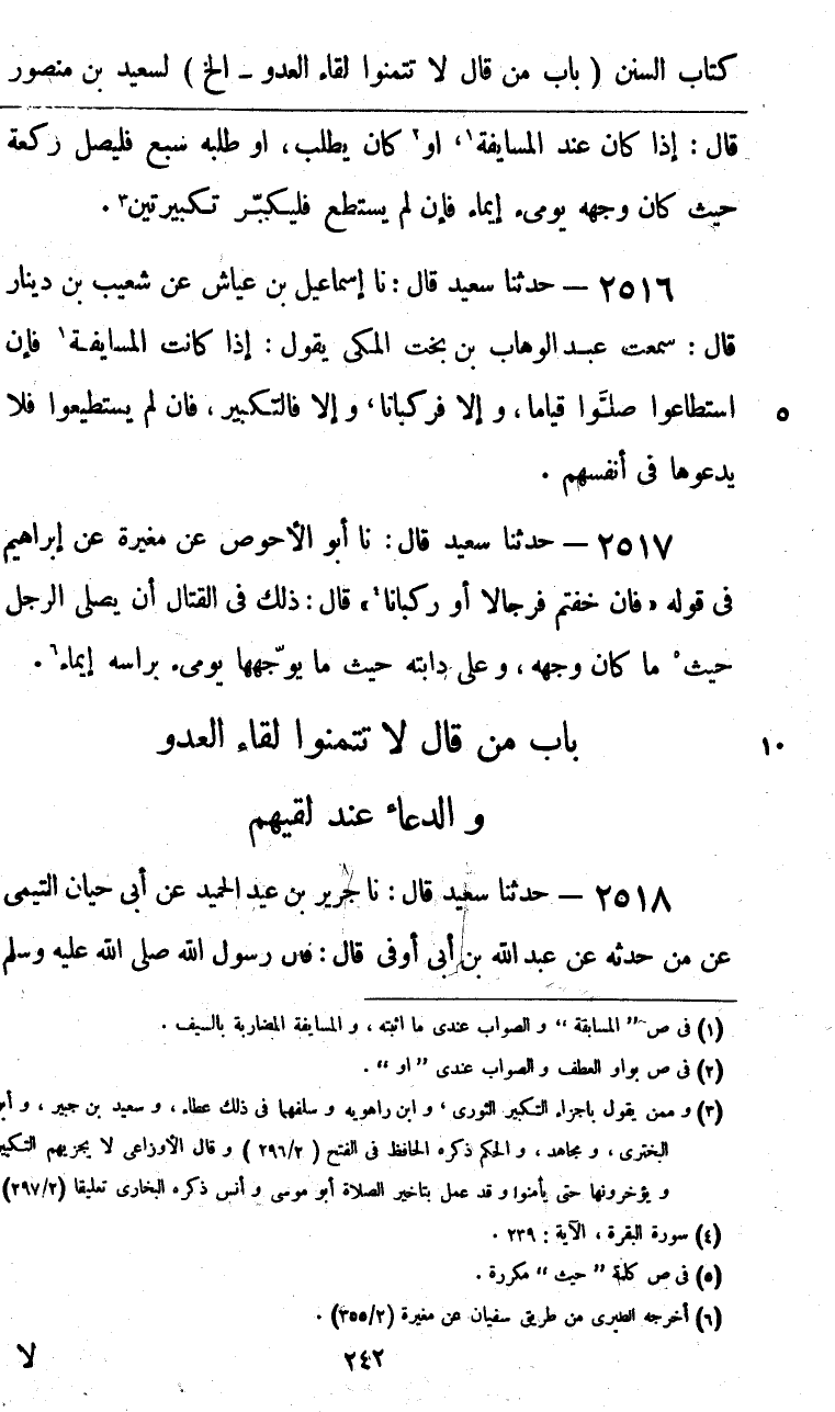 2518 - حَدَّثَنَا سَعِيدٌ قَالَ: نا جَرِيرُ بْنُ عَبْدِ الْحَمِيدِ، عَنْ أَبِي حَيَّانَ التَّيْمِيِّ، عَمَّنْ حَدَّثَهُ، عَنْ عَبْدِ اللَّهِ بْنِ أَبِي أَوْفَى، قَالَ: قَالَ رَسُولُ اللَّهِ صَلَّى اللهُ عَلَيْهِ وَسَلَّمَ -[243]-: «§لَا تَتَمَنَّوْا لِقَاءَ الْعَدُوِّ، وَاسْأَلُوا اللَّهَ الْعَافِيَةَ، وَاعْلَمُوا أَنَّ الْجَنَّةَ تَحْتَ ظِلَالِ السُّيُوفِ»