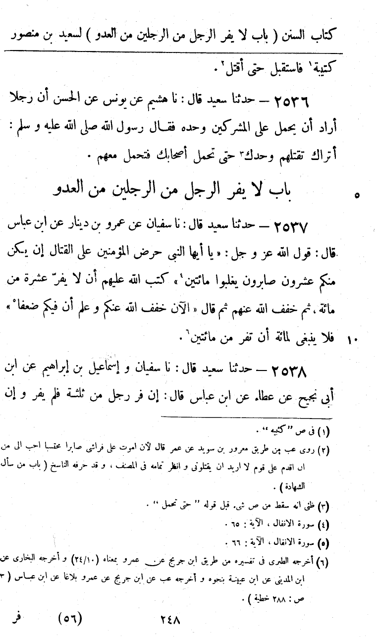 2537 - حَدَّثَنَا سَعِيدٌ قَالَ: نا سُفْيَانُ، عَنْ عَمْرِو بْنِ دِينَارٍ، عَنِ ابْنِ عَبَّاسٍ، قَالَ: قَوْلُ اللَّهِ عَزَّ وَجَلَّ: {§يَا أَيُّهَا النَّبِيُّ حَرِّضِ الْمُؤْمِنِينَ عَلَى الْقِتَالِ إِنْ يَكُنْ مِنْكُمْ عِشْرُونَ صَابِرُونَ يَغْلِبُوا مِائَتَيْنِ} كَتَبَ اللَّهُ عَلَيْهِمْ أَنْ لَا يَفِرَّ عَشَرَةٌ مِنْ مِائَةٍ، ثُمَّ خَفَّفَ اللَّهُ عَنْهُمْ ثُمَّ قَالَ: {الْآنَ خَفَّفَ اللَّهُ عَنْكُمْ وَعَلِمَ أَنَّ فِيكُمْ ضَعْفًا} [الأنفال: 66] فَلَا يَنْبَغِي لِمِائَةٍ أَنْ تَفِرَّ مِنْ مِائَتَيْنِ "