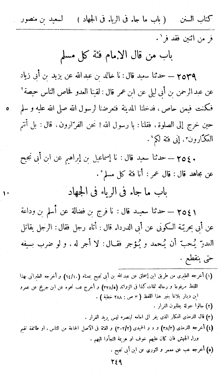 2540 - حَدَّثَنَا سَعِيدٌ قَالَ: نا إِسْمَاعِيلُ بْنُ إِبْرَاهِيمَ، عَنِ ابْنِ أَبِي نَجِيحٍ، عَنْ مُجَاهِدٍ، قَالَ: قَالَ عُمَرُ: «§أَنَا فِئَةُ، كُلِّ مُسْلِمٍ»