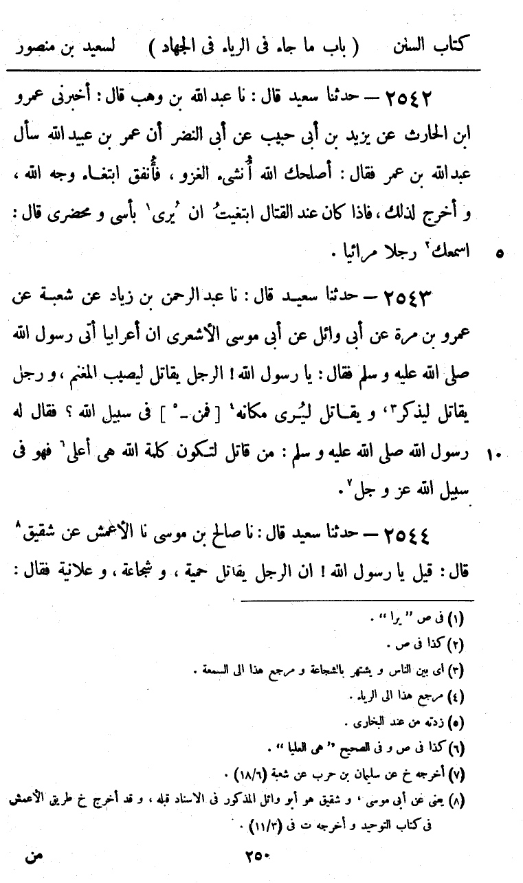 2542 - حَدَّثَنَا سَعِيدٌ قَالَ: نا عَبْدُ اللَّهِ بْنُ وَهْبٍ، قَالَ: أَخْبَرَنِي عَمْرُو بْنُ الْحَارِثِ، عَنْ يَزِيدَ بْنِ أَبِي حَبِيبٍ، عَنْ أَبِي النَّضْرِ، أَنَّ عُمَرَ بْنَ عُبَيْدِ اللَّهِ، سَأَلَ عَبْدَ اللَّهِ بْنَ عُمَرَ فَقَالَ: أَصْلَحَكَ اللَّهُ أُنْشِئُ الْغَزْوَ فَأُنْفِقُ ابْتِغَاءَ وَجْهِ اللَّهِ، وَأَخْرُجُ لِذَلِكَ، فَإِذَا كَانَ عِنْدَ الْقِتَالِ ابْتَغَيْتُ أَنْ يُرَى بَأْسِي وَمَحْضَرِي قَالَ: «§أَسْمَعُكَ رَجُلًا مُرَائِيًا»