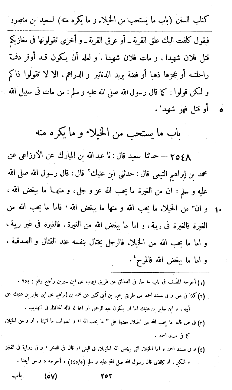2548 - حَدَّثَنَا سَعِيدٌ قَالَ: نا عَبْدُ اللَّهِ بْنُ الْمُبَارَكِ، عَنِ الْأَوْزَاعِيِّ، عَنْ مُحَمَّدِ بْنِ إِبْرَاهِيمَ التَّيْمِيِّ، قَالَ: حَدَّثَنِي ابْنُ عَتِيكٍ، قَالَ: قَالَ رَسُولُ اللَّهِ صَلَّى اللهُ عَلَيْهِ وَسَلَّمَ: «إِنَّ §مِنَ الْغَيْرَةِ مَا يُحِبُّ اللَّهُ عَزَّ وَجَلَّ، وَمِنْهَا مَا يَبْغَضُ اللَّهُ، وَإِنَّ مِنَ الْخُيَلَاءِ مَا يُحِبُّ اللَّهُ وَمِنْهَا مَا يَبْغَضُ اللَّهُ، فَأَمَّا مَا يُحِبُّ اللَّهُ مِنَ الْغَيْرَةِ فَالْغَيْرَةُ فِي رِيبَةٍ، وَأَمَّا مَا يُبْغِضُ اللَّهُ مِنَ الْغَيْرَةِ، فَالْغَيْرَةُ مِنْ غَيْرِ رِيبَةٍ، وَأَمَّا مَا يُحِبُّ اللَّهُ مِنَ الْخُيَلَاءِ، فَالرَّجُلُ يَخْتَالُ بِنَفْسِهِ عِنْدَ الْقِتَالِ وَالصَّدَقَةِ، وَأَمَّا مَا يَبْغَضُ اللَّهُ فَالْمَرَحُ»