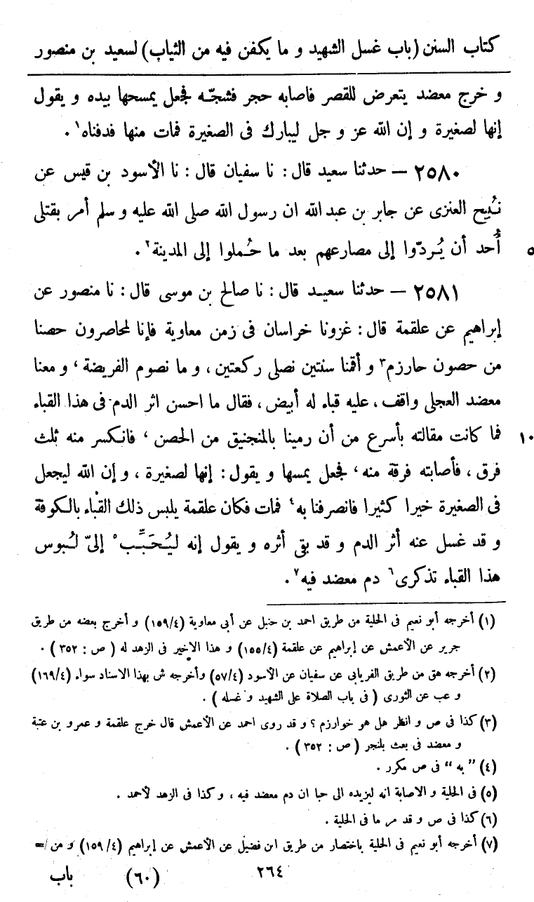 2581 - حَدَّثَنَا سَعِيدٌ قَالَ: نا صَالِحُ بْنُ مُوسَى، قَالَ: نا مَنْصُورٌ، عَنْ إِبْرَاهِيمَ، عَنْ عَلْقَمَةَ، قَالَ: " §غَزَوْنَا خُرَاسَانَ فِي زَمَنِ مُعَاوِيَةَ فَإِنَّا لَمُحَاصِرُونَ حِصْنًا مِنْ حُصُونِ حَارِزْمَ، وَأَقَمْنَا سَنَتَيْنِ نُصَلِّي رَكْعَتَيْنِ، وَمَا نَصُوصُ الْفَرِيضَةَ، وَمَعَنَا مِعْضَدٌ الْعِجْلِيُّ وَاقِفٌ عَلَيْهِ قَبَاءٌ لَهُ أَبْيَضُ، فَقَالَ: مَا أَحْسَنَ أَثَرَ الدَّمِ فِي هَذَا الْقَبَاءِ، فَمَا كَانَتْ مَقَالَتُهُ بِأَسْرَعَ مِنْ أَنْ رُمِينَا بِالْمَنْجَنِيقِ مِنَ الْحِصْنِ، فَانْكَسَرَ مِنْهُ ثَلَاثُ فِرَقٍ، فَأَصَابَتْهُ فِرْقَةٌ مِنْهُ، فَجَعَلَ يَمَسُّهَا وَيَقُولُ: إِنَّهَا لَصَغِيرَةٌ، وَإِنَّ اللَّهَ لَيَجْعَلُ فِي الصَّغِيرَةِ خَيْرًا كَثِيرًا، فَانْصَرَفْنَا بِهِ، فَمَاتَ " فَكَانَ عَلْقَمَةُ يَلْبَسُ ذَلِكَ الْقَبَاءَ بِالْكُوفَةِ، وَقَدْ غَسَلَ عَنْهُ أَثَرَ الدَّمِ، وَقَدْ بَقِيَ أَثَرُهُ، وَيَقُولُ: «إِنَّهُ لَيُحَبِّبُ إِلَيَّ لَبُوسَ هَذَا الْقَبَاءِ تَذَكُّرِي دَمَ مِعْضَدٍ فِيهِ»