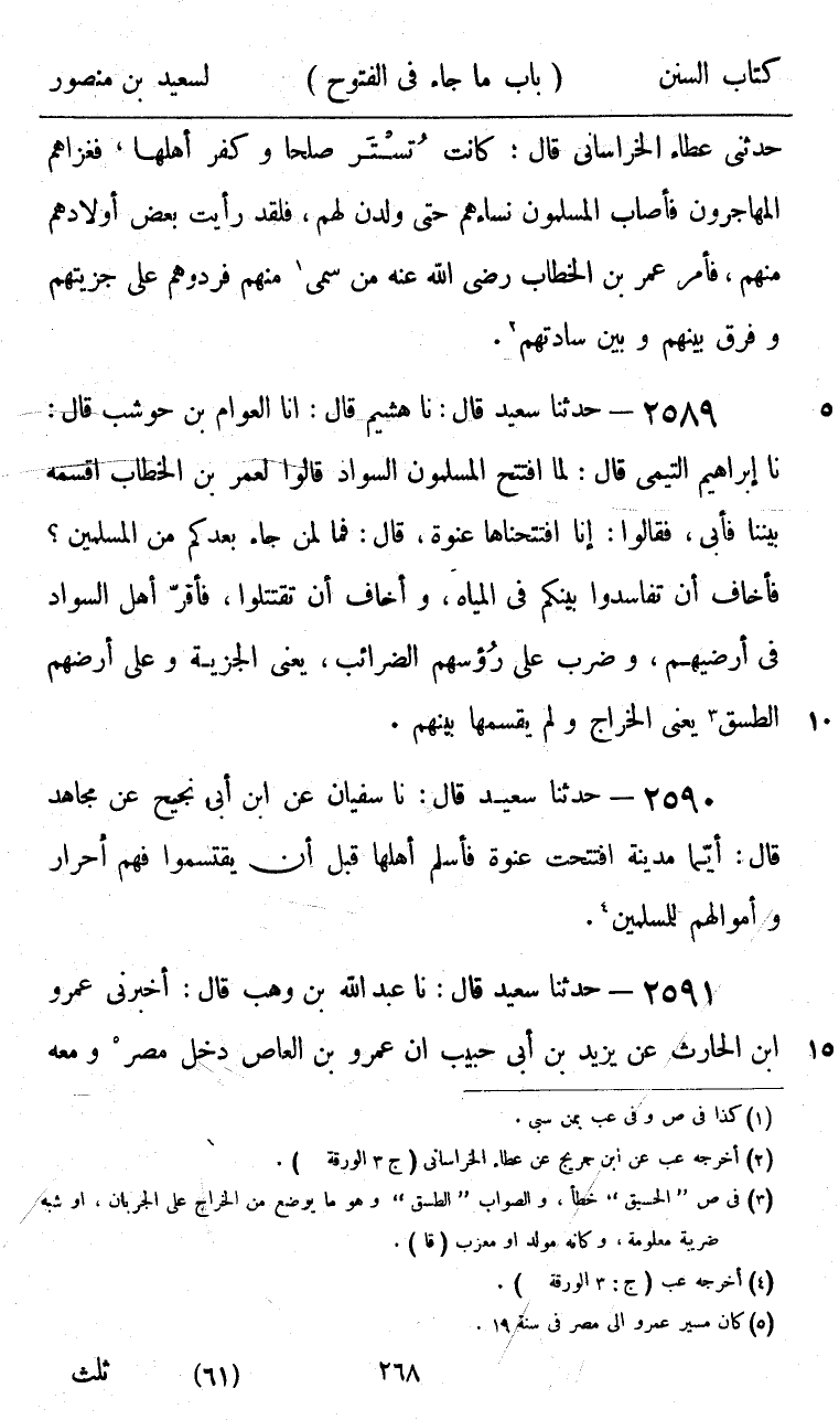 2589 - حَدَّثَنَا سَعِيدٌ قَالَ: نا هُشَيْمٌ، قَالَ: أنا الْعَوَّامُ بْنُ حَوْشَبٍ، قَالَ: نا إِبْرَاهِيمُ التَّيْمِيُّ، قَالَ: لَمَّا افْتَتَحَ الْمُسْلِمُونَ السَّوَادَ قَالُوا لِعُمَرَ بْنِ الْخَطَّابِ: اقْسِمْهُ بَيْنَنَا فَأَبَى، فَقَالُوا: إِنَّا افْتَتَحْنَاهَا عَنْوَةً قَالَ: «§فَمَا لِمَنْ جَاءَ بَعْدَكُمْ مِنَ الْمُسْلِمِينَ؟ فَأَخَافُ أَنْ تَفَاسَدُوا بَيْنَكُمْ فِي الْمِيَاهِ، وَأَخَافُ أَنْ تَقْتَتِلُوا» فَأَقَرَّ أَهْلَ السَّوَادِ فِي أَرَضِيهِمْ، وَضَرَبَ عَلَى رُءُوسِهِمُ الضَّرَائِبَ - يَعْنِي الْجِزْيَةَ - وَعَلَى أَرْضِهِمُ الطَّسْقَ يَعْنِي الْخَرَاجَ، وَلَمْ يَقْسِمْهَا بَيْنَهُمْ