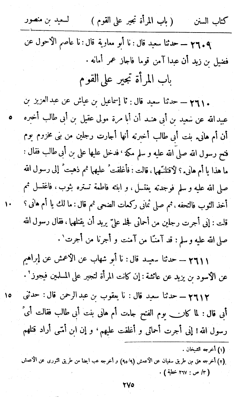 2611 - حَدَّثَنَا سَعِيدٌ قَالَ: نا أَبُو شِهَابٍ، عَنِ الْأَعْمَشِ، عَنْ إِبْرَاهِيمَ، عَنِ الْأَسْوَدِ بْنِ يَزِيدَ، عَنْ عَائِشَةَ،: «إِنْ §كَانَتِ الْمَرْأَةُ لَتُجِيرُ عَلَى الْمُسْلِمِينَ فَيَجُوزُ»