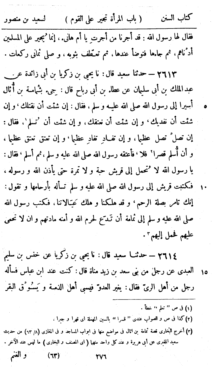 2613 - حَدَّثَنَا سَعِيدٌ قَالَ: نا يَحْيَى بْنُ زَكَرِيَّا بْنِ أَبِي زَائِدَةَ، عَنْ عَبْدِ الْمَلِكِ بْنِ أَبِي سُلَيْمَانَ، عَنْ عَطَاءِ بْنِ أَبِي رَبَاحٍ، قَالَ: جِيءَ بِثُمَامَةَ بْنِ أُثَالٍ أَسِيرًا إِلَى رَسُولِ اللَّهِ صَلَّى اللهُ عَلَيْهِ وَسَلَّمَ، فَقَالَ: «§إِنْ شِئْتَ أَنْ نَقْتُلَكَ، وَإِنْ شِئْتَ أَنْ نَفْدِيَكَ، وَإِنْ شِئْتَ أَنْ نَعْتِقَكَ، وَإِنْ شِئْتَ أَنْ تُسْلِمَ» ، فَقَالَ: إِنْ تَصِلْ تَصِلْ عَظِيمًا، وَإِنْ تُفَادِ تُفَادِ عَظِيمًا، وَإِنْ تُعْتِقْ تُعْتِقْ عَظِيمًا، وَإِنْ أُسْلِمْ قَسْرًا فَلَا، فَأَعْتَقَهُ رَسُولُ اللَّهِ صَلَّى اللهُ عَلَيْهِ وَسَلَّمَ، ثُمَّ أَسْلَمَ، فَقَالَ: يَا رَسُولَ اللَّهِ، لَا تُحْمَلُ إِلَى قُرَيْشٍ حَبَّةٌ وَلَا تَمْرَةٌ حَتَّى يَأْذَنَ اللَّهُ وَرَسُولُهُ، فَكَتَبَتْ قُرَيْشٌ إِلَى رَسُولِ اللَّهِ صَلَّى اللهُ عَلَيْهِ وَسَلَّمَ تَسْأَلُهُ بِأَرْحَامِهَا، وَتَقُولُ: إِنَّكَ تَأْمُرُ بِصِلَةِ الرَّحِمِ، وَقَدْ هَلَكْنَا وَهَلَكَ عِيَالَاتُنَا، فَكَتَبَ رَسُولُ اللَّهِ صَلَّى اللهُ عَلَيْهِ وَسَلَّمَ إِلَى ثُمَامَةَ «أَنْ تَدَعَ لِحَرَمِ اللَّهِ وَأَمْنِهِ مَادَّتَهُمْ، وَأَنْ لَا تَحْمِيَ عَلَيْهِمْ» فَحَمَلَ إِلَيْهِمْ