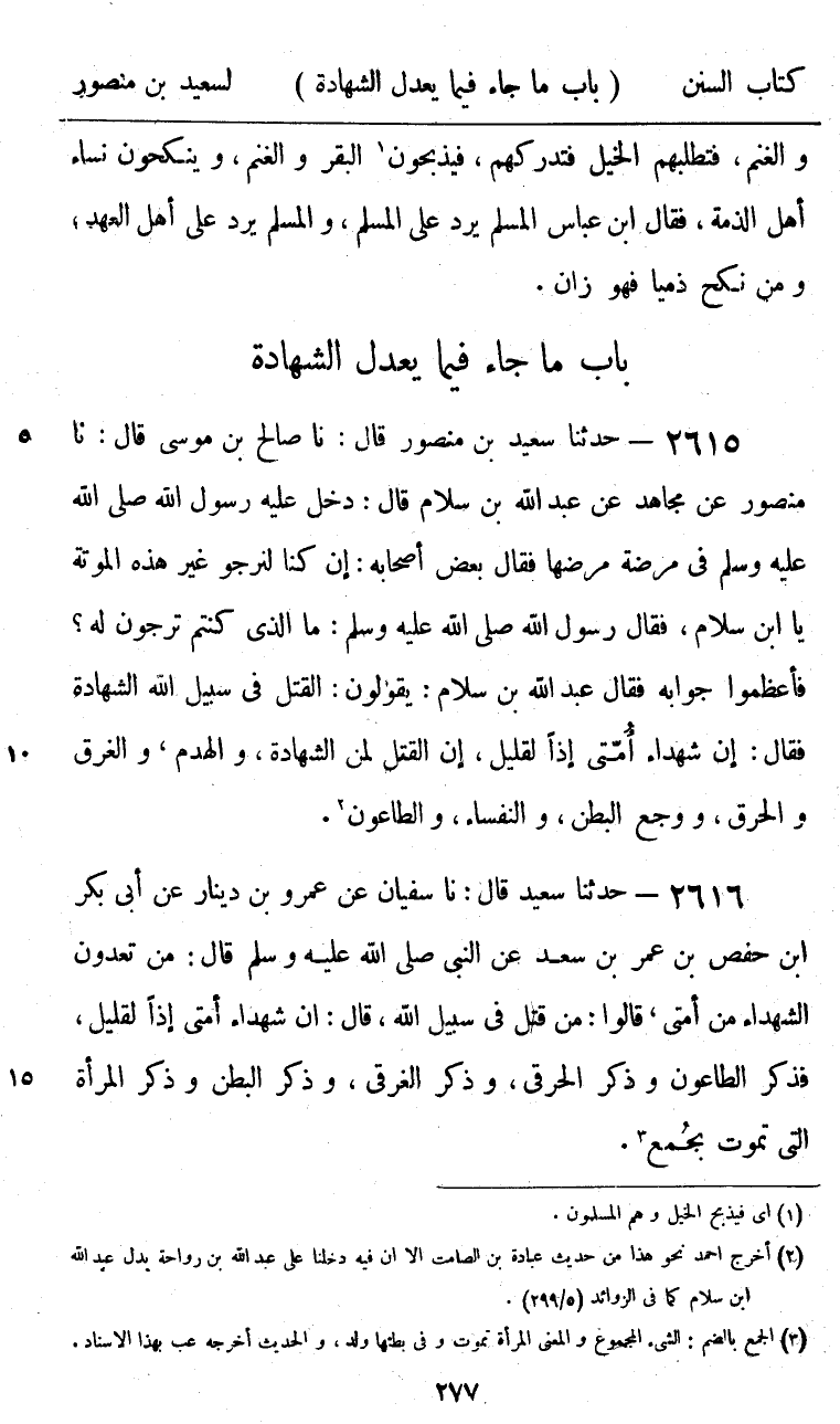 2615 - حَدَّثَنَا سَعِيدُ بْنُ مَنْصُورٍ قَالَ: نا صَالِحُ بْنُ مُوسَى، قَالَ: نا مَنْصُورٌ، عَنْ مُجَاهِدٍ، عَنْ عَبْدِ اللَّهِ بْنِ سَلَامٍ، قَالَ: دَخَلَ عَلَيْهِ رَسُولُ اللَّهِ صَلَّى اللهُ عَلَيْهِ وَسَلَّمَ فِي مَرْضَةٍ مَرِضَهَا، فَقَالَ بَعْضُ أَصْحَابِهِ: إِنْ كُنَّا لَنَرْجُو غَيْرَ هَذِهِ الْمُوتَةِ يَا ابْنَ سَلَامٍ، فَقَالَ رَسُولُ اللَّهِ صَلَّى اللهُ عَلَيْهِ وَسَلَّمَ: «مَا الَّذِي كُنْتُمْ تَرْجُونَ لَهُ؟» فَأَعْظَمُوا جَوَابَهُ، فَقَالَ عَبْدُ اللَّهِ بْنُ سَلَامٍ: يَقُولُونَ: الْقَتْلُ فِي سَبِيلِ: الشَّهَادَةُ، فَقَالَ: «إِنَّ §شُهَدَاءَ أُمَّتِي إِذًا لَقَلِيلٌ إِنَّ الْقَتْلَ لَمِنَ الشَّهَادَةِ، وَالْهَدْمَ، وَالْغَرَقَ، وَالْحَرْقَ، وَوَجَعَ الْبَطْنِ، وَالنُّفَسَاءَ، وَالطَّاعُونَ»