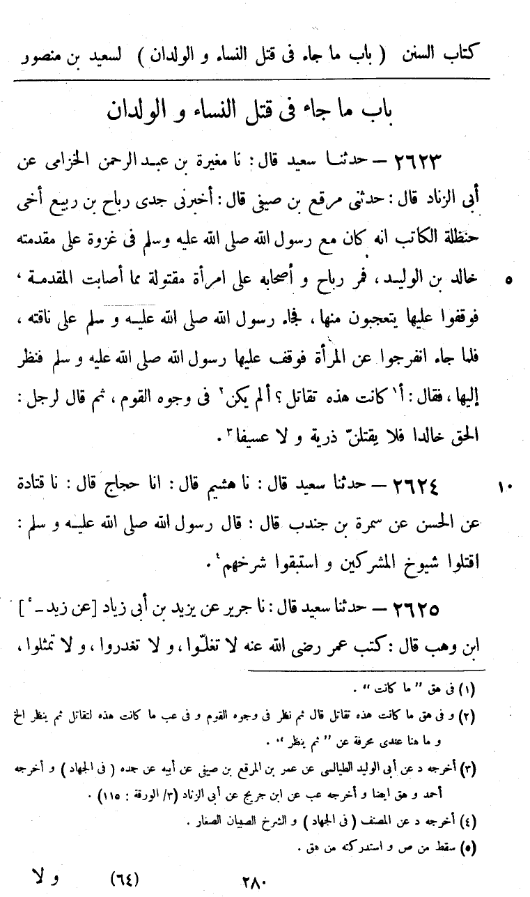 2623 - حَدَّثَنَا سَعِيدٌ قَالَ: نا مُغِيرَةُ بْنُ عَبْدِ الرَّحْمَنِ الْخِزَامِيُّ، عَنْ أَبِي الزِّنَادِ، قَالَ: حَدَّثَنِي مُرَقَّعُ بْنُ صَيْفِيٍّ، قَالَ: أَخْبَرَنِي جَدِّي رَبَاحُ بْنُ رَبِيعٍ أَخو حَنْظَلَةَ الْكَاتِبِ أَنَّهُ كَانَ مَعَ رَسُولِ اللَّهِ صَلَّى اللهُ عَلَيْهِ وَسَلَّمَ فِي غَزْوَةٍ عَلَى مُقَدِّمَتِهَا خَالِدُ بْنُ الْوَلِيدِ، فَمَرَّ رَبَاحٌ وَأَصْحَابُهُ عَلَى امْرَأَةٍ مَقْتُولَةٍ مِمَّا أَصَابَتِ الْمُقَدِّمَةُ، فَوَقَفُوا عَلَيْهَا يَتَعَجَّبُونَ مِنْهَا، فَجَاءَ رَسُولُ اللَّهِ صَلَّى اللهُ عَلَيْهِ وَسَلَّمَ عَلَى نَاقَتِهِ، فَلَمَّا جَاءَ انْفَرَجُوا عَنِ الْمَرْأَةِ فَوَقَفَ عَلَيْهَا رَسُولُ اللَّهِ صَلَّى اللهُ عَلَيْهِ وَسَلَّمَ فَنَظَرَ إِلَيْهَا فَقَالَ: «أَكَانَتْ هَذِهِ تُقَاتِلُ؟ أَلَمْ يَكُنْ فِي وُجُوهِ الْقَوْمِ» ثُمَّ قَالَ لِرَجُلٍ: «§الْحَقْ خَالِدًا فَلَا يَقْتُلَنَّ ذُرِّيَّةً وَلَا عَسِيفًا»