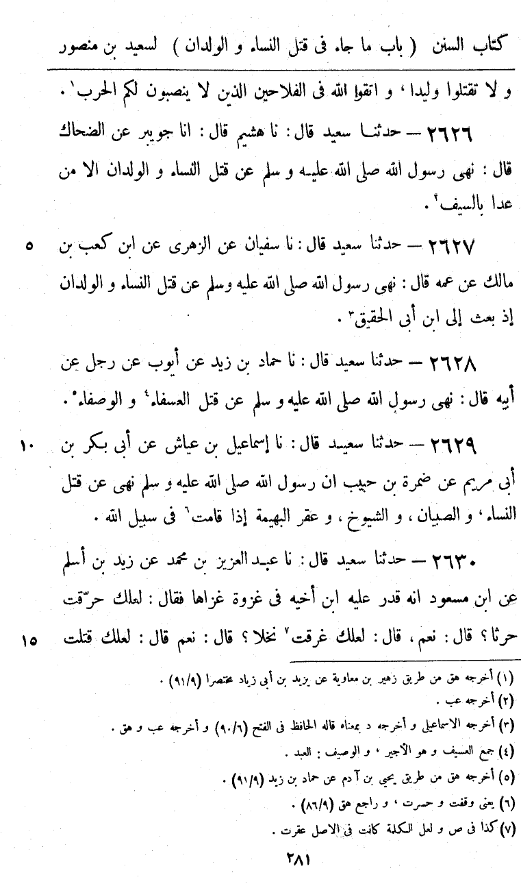 2626 - حَدَّثَنَا سَعِيدٌ قَالَ: نا هُشَيْمٌ، قَالَ: أنا جُوَيْبِرٌ، عَنِ الضَّحَّاكِ، قَالَ: «§نَهَى رَسُولُ اللَّهِ صَلَّى اللهُ عَلَيْهِ وَسَلَّمَ عَنْ قَتْلِ النِّسَاءِ وَالْوِلْدَانِ إِلَّا مَنْ عَدَا بِالسَّيْفِ»