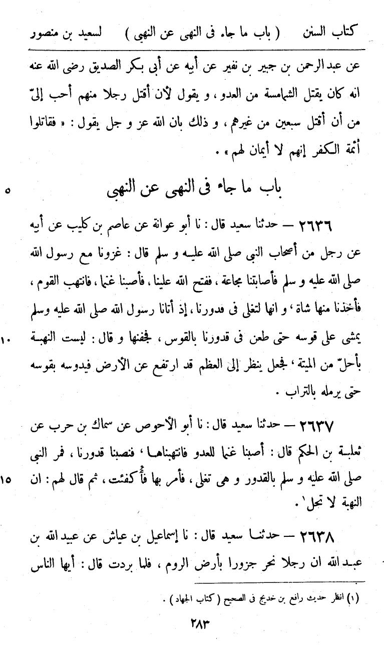 2637 - حَدَّثَنَا سَعِيدٌ قَالَ: نا أَبُو الْأَحْوَصِ، عَنْ سِمَاكِ بْنِ حَرْبٍ، عَنْ ثَعْلَبَةَ بْنِ الْحَكَمِ، قَالَ: أَصَبْنَا غَنَمًا لِلْعَدُوِّ فَانْتَهَبْنَاهَا، فَنَصَبْنَا قُدُورَنَا، فَمَرَّ النَّبِيُّ صَلَّى اللهُ عَلَيْهِ وَسَلَّمَ بِالْقُدُورِ، وَهِيَ تَغْلِي، فَأَمَرَ بِهَا فَأُكْفِئَتْ، ثُمَّ قَالَ لَهُمْ: «إِنَّ §النُّهْبَةَ لَا تَحِلُّ»