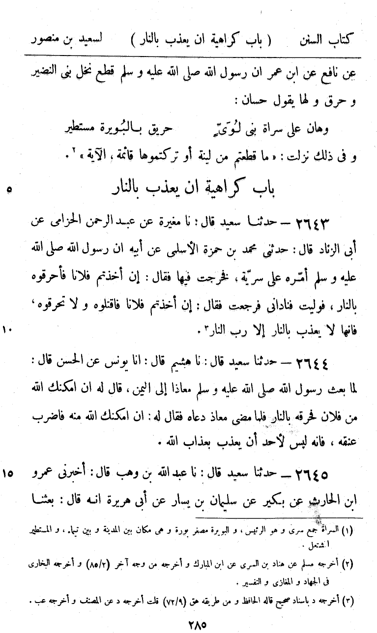 2643 - حَدَّثَنَا سَعِيدٌ قَالَ: نا مُغِيرَةُ، عَنْ عَبْدِ الرَّحْمَنِ الْحِزَامِيِّ، عَنْ أَبِي الزِّنَادِ، قَالَ: حَدَّثَنِي مُحَمَّدُ بْنُ حَمْزَةَ الْأَسْلَمِيُّ، عَنْ أَبِيهِ، أَنَّ رَسُولَ اللَّهِ صَلَّى اللهُ عَلَيْهِ وَسَلَّمَ أَمَّرَهُ عَلَى سَرِيَّةٍ، فَخَرَجْتُ فِيهَا فَقَالَ: «إِنْ أَخَذْتُمْ فُلَانًا فَأَحْرِقُوهُ بِالنَّارِ» فَوَلَّيْتُ، فَنَادَانِي، فَرَجَعْتُ، فَقَالَ: «إِنْ أَخَذْتُمْ فُلَانًا فَاقْتُلُوهُ وَلَا تُحَرِّقُوهُ، فَإِنَّهُ §لَا يُعَذِّبُ بِالنَّارِ إِلَّا رَبُّ النَّارِ»