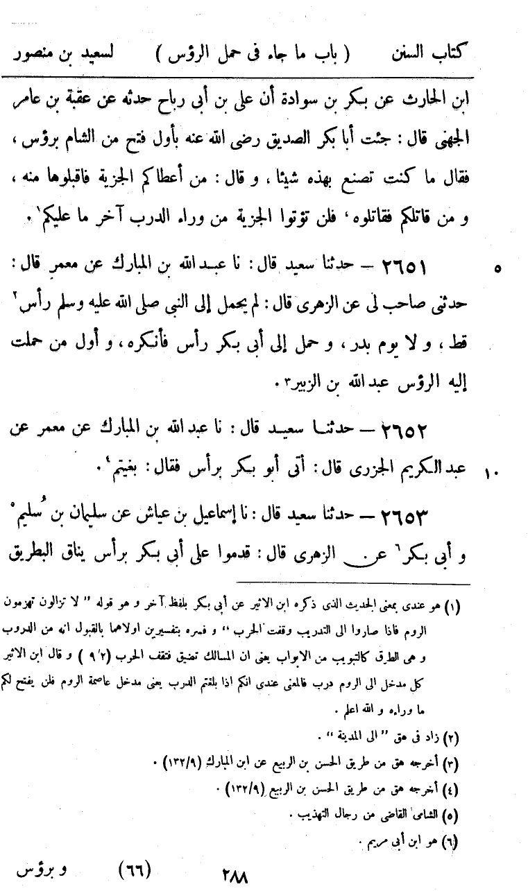 2651 - حَدَّثَنَا سَعِيدٌ قَالَ: نا عَبْدُ اللَّهِ بْنُ الْمُبَارَكِ، عَنْ مَعْمَرٍ، قَالَ: حَدَّثَنِي صَاحِبٌ لِي، عَنِ الزُّهْرِيِّ قَالَ: «§لَمْ يُحْمَلْ إِلَى النَّبِيِّ صَلَّى اللهُ عَلَيْهِ وَسَلَّمَ رَأْسٌ قَطُّ، وَلَا يَوْمَ بَدْرٍ، وَحُمِلَ إِلَى أَبِي بَكْرٍ رَأْسٌ فَأَنْكَرَهُ، وَأَوَّلُ مَنْ حُمِلَتْ إِلَيْهِ الرُّءُوسُ عَبْدُ اللَّهِ بْنُ الزُّبَيْرِ»