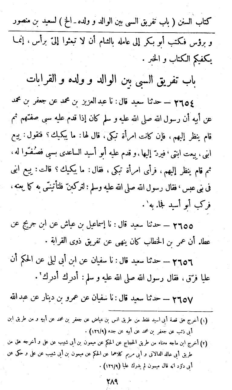 2657 - حَدَّثَنَا سَعِيدٌ قَالَ: نا سُفْيَانُ، عَنْ عَمْرِو بْنِ دِينَارٍ، عَنْ عَبْدِ اللَّهِ -[290]- بْنِ فَرُّوخَ، عَنْ أَبِيهِ، أَنَّهُ قَالَ: كَتَبَ إِلَيْنَا عُمَرُ بْنُ الْخَطَّابِ «§لَا تُفَرِّقُوا بَيْنَ الْأَخَوَيْنِ، وَلَا بَيْنَ الْأُمِّ وَوَلَدِهَا فِي الْبَيْعِ» وَقَالَ سُفْيَانُ مَرَّةً: كَتَبَ إِلَيَّ نَافِعُ بْنُ عَبْدِ الْحَارِثِ بِذَلِكَ