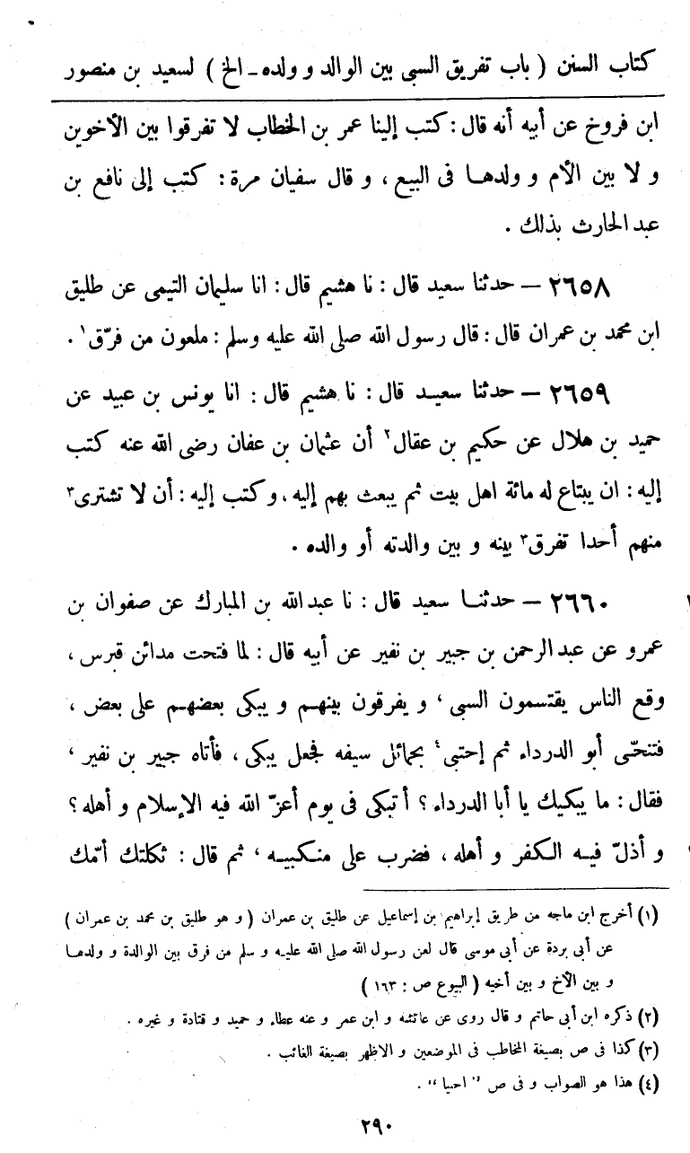2659 - حَدَّثَنَا سَعِيدٌ قَالَ: نا هُشَيْمٌ، قَالَ: أنا يُونُسُ بْنُ عُبَيْدٍ، عَنْ حُمَيْدِ بْنِ هِلَالٍ، عَنْ حَكِيمِ بْنِ عِقَالٍ، أَنَّ عُثْمَانَ بْنَ عَفَّانَ، رَضِيَ اللَّهُ عَنْهُ كَتَبَ إِلَيْهِ: " أَنْ يَبْتَاعَ لَهُ مِائَةَ أَهْلِ بَيْتٍ، ثُمَّ يَبْعَثَ بِهِمْ إِلَيْهِ، وَكَتَبَ إِلَيْهِ: «أَنْ §لَا تَشْتَرِيَ مِنْهُمْ أَحَدًا تُفَرِّقُ بَيْنَهُ وَبَيْنَ وَالِدَتِهِ أَوْ وَالِدِهِ»