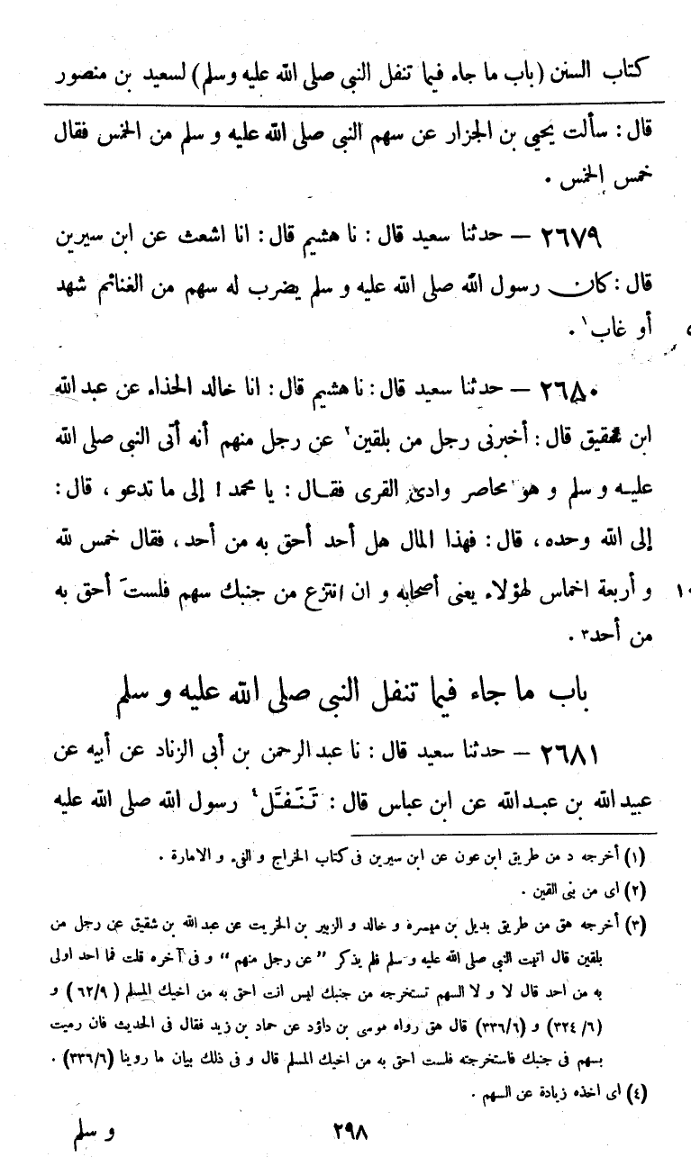 2680 - حَدَّثَنَا سَعِيدٌ قَالَ: نا هُشَيْمٌ، قَالَ: أنا خَالِدٌ الْحَذَّاءُ، عَنْ عَبْدِ اللَّهِ بْنِ شَقِيقٍ قَالَ: أَخْبَرَنِي رَجُلٌ مِنْ بَلْقَيْنِ عَنْ رَجُلٍ مِنْهُمْ أَنَّهُ أَتَى النَّبِيَّ صَلَّى اللهُ عَلَيْهِ وَسَلَّمَ وَهُوَ مُحَاصِرٌ وَادِيَ الْقُرَى، فَقَالَ: يَا مُحَمَّدُ إِلَى مَا تَدْعُو قَالَ: «إِلَى اللَّهِ وَحْدَهُ» قَالَ: فَهَذَا الْمَالُ هَلْ أَحَدٌ أَحَقُّ بِهِ مِنْ أَحَدٍ؟ فَقَالَ: «§خُمُسٌ لِلَّهِ وَأَرْبَعَةُ أَخْمَاسٍ لِهَؤُلَاءِ - يَعْنِي أَصْحَابَهُ - وَإِنِ انْتُزِعَ مِنْ جَنْبِكَ سَهْمٌ، فَلَسْتَ أَحَقَّ بِهِ مِنْ أَحَدٍ»