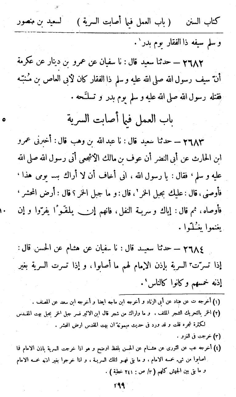 2684 - حَدَّثَنَا سَعِيدٌ قَالَ: نا سُفْيَانُ، عَنْ هِشَامٍ، عَنِ الْحَسَنِ، قَالَ: «§إِذَا تَسَرَّتِ السَّرِيَّةُ بِإِذْنِ الْإِمَامِ، لَهُمْ مَا أَصَابُوا، وَإِذَا تَسَرَّتِ السَّرِيَّةُ بِغَيْرِ إِذْنِهِ خَمَّسَهُمْ وَكَانُوا كَالنَّاسِ»