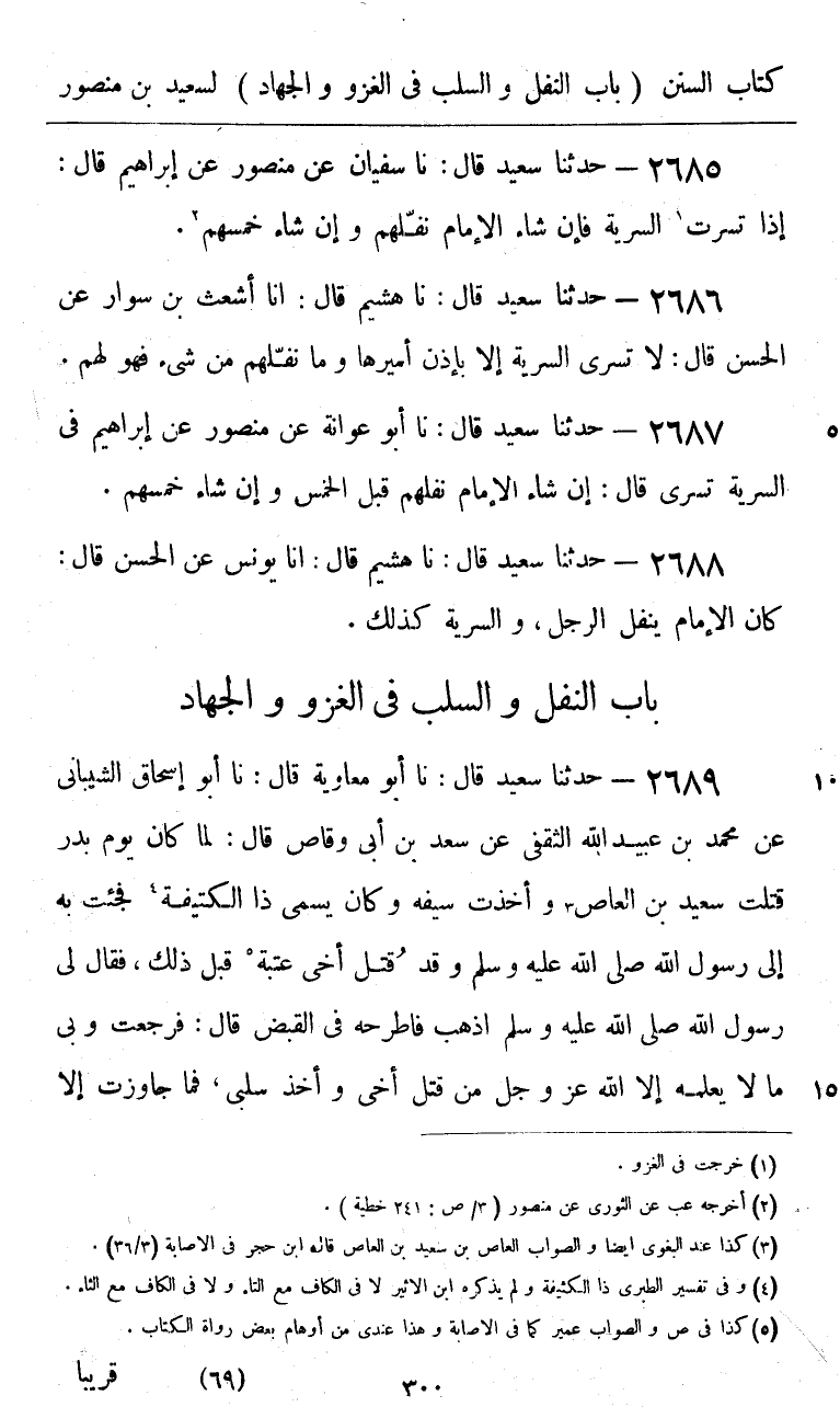 2685 - حَدَّثَنَا سَعِيدٌ قَالَ: نا سُفْيَانُ، عَنْ مَنْصُورٍ، عَنْ إِبْرَاهِيمَ، قَالَ: «§إِذَا تَسَرَّتِ السَّرِيَّةُ، فَإِنْ شَاءَ الْإِمَامُ نَفَّلَهُمْ، وَإِنْ شَاءَ خَمَّسَهُمْ»