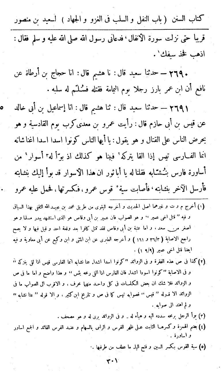 2691 - حَدَّثَنَا سَعِيدٌ قَالَ: ثنا هُشَيْمٌ، قَالَ: أنا إِسْمَاعِيلُ بْنُ أَبِي خَالِدٍ، عَنْ قَيْسِ بْنِ أَبِي حَازِمٍ، قَالَ: رَأَيْتُ عَمْرَو بْنَ مَعْدِي كَرِبَ يَوْمَ الْقَادِسِيَّةِ وَهُوَ يُحَرِّضُ النَّاسَ عَلَى الْقِتَالِ، وَهُوَ يَقُولُ: يَا أَيُّهَا النَّاسُ §كُونُوا أَسَدًا أَسَدًا أَغْنَى شَاتَهُ، إِنَّمَا الْفَارِسِيُّ تَيْسٌ إِذَا لَقِيَ يَتْرُكُهُ، فَبَيْنَا هُوَ كَذَلِكَ إِذْ بَوَّأَ لَهُ أَسْوَارٌ مِنْ أَسَاوِرَةِ فَارِسَ بِنُشَّابَةٍ، فَقُلْنَا لَهُ: يَا أَبَا ثَوْرٍ إِنَّ هَذَا الْأَسْوَارَ قَدْ بَوَّأَ إِلَيْكَ بِنُشَّابَتِهِ فَأَرْسَلَ الْآخَرُ بِنُشَّابَتِهِ، فَأَصَابَتْ سِيَةَ قَوْسِ عَمْرٍو، فَكَسَرَتْهَا، فَحَمَلَ عَلَيْهِ عَمْرٌو -[302]- فَطَعَنَهُ، فَدَقَّ صُلْبَهُ، فَصَرَعَهُ، وَنَزَلَ إِلَيْهِ، فَقَطَعَ يَدَيْهِ، وَأَخَذَ سِوَارَيْنِ كَانَا عَلَيْهِ وَيَمْلَقًا مِنْ دِيبَاجٍ وَمِنْطَقَةً فَسُلِّمَ ذَلِكَ لَهُ "