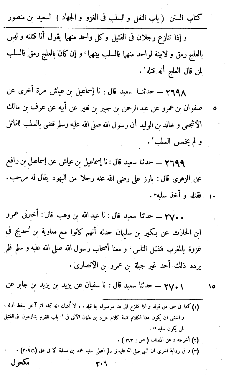 2698 - حَدَّثَنَا سَعِيدٌ قَالَ: نا إِسْمَاعِيلُ بْنُ عَيَّاشٍ، مَرَّةً أُخْرَى عَنْ صَفْوَانَ بْنِ عَمْرٍو، عَنْ عَبْدِ الرَّحْمَنِ بْنِ جُبَيْرِ بْنِ نُفَيْرٍ، عَنْ أَبِيهِ، عَنْ عَوْفِ بْنِ مَالِكٍ الْأَشْجَعِيِّ، وَخَالِدِ بْنِ الْوَلِيدِ، «أَنَّ رَسُولَ اللَّهِ صَلَّى اللهُ عَلَيْهِ وَسَلَّمَ §قَضَى بِالسَّلَبِ لِلْقَاتِلِ وَلَمْ يُخَمِّسِ السَّلَبَ»