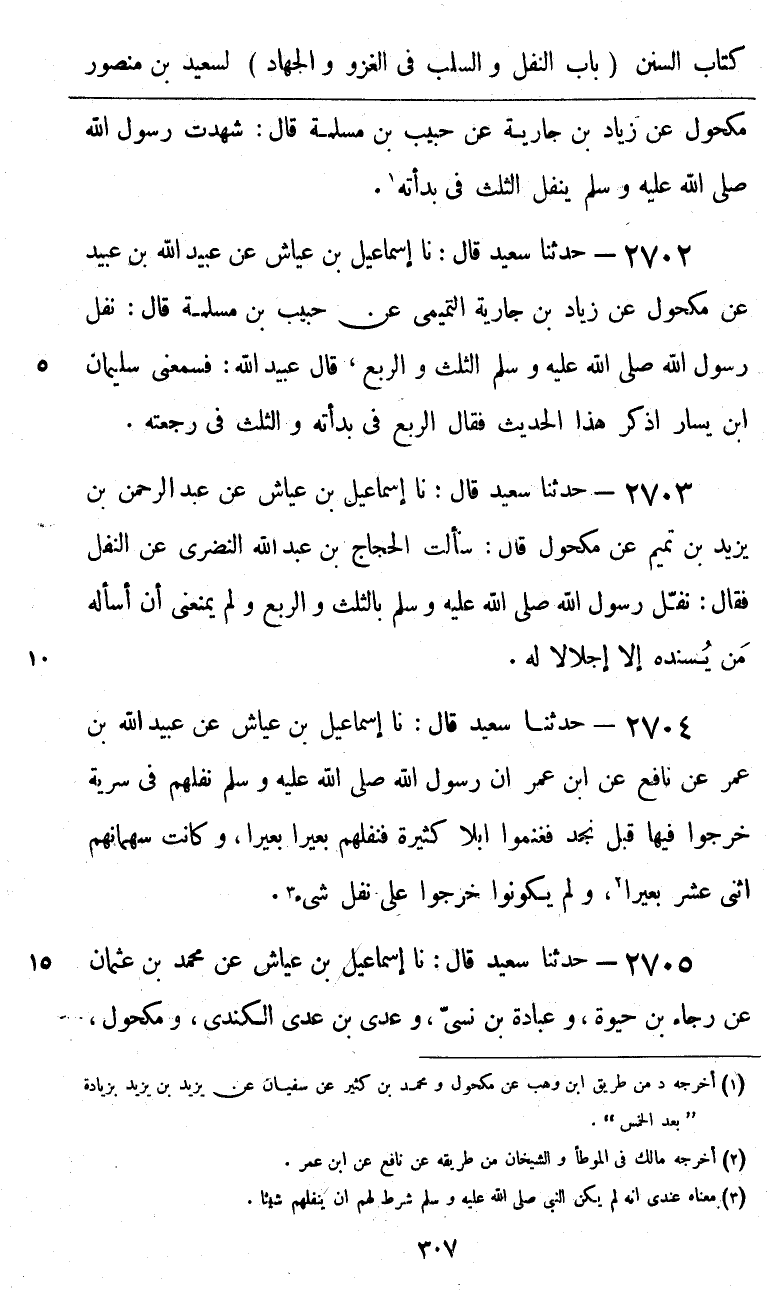 2703 - حَدَّثَنَا سَعِيدٌ قَالَ: نا إِسْمَاعِيلُ بْنُ عَيَّاشٍ، عَنْ عَبْدِ الرَّحْمَنِ بْنِ يَزِيدَ بْنِ تَمِيمٍ، عَنْ مَكْحُولٍ، قَالَ: سَأَلْتُ الْحَجَّاجَ بْنَ عَبْدِ اللَّهِ النَّضْرِيَّ عَنِ النَّفْلِ، فَقَالَ: «§نَفَّلَ رَسُولُ اللَّهِ صَلَّى اللهُ عَلَيْهِ وَسَلَّمَ بِالثُّلُثِ وَالرُّبُعِ» وَلَمْ يَمْنَعْنِي أَنْ أَسْأَلَهُ مَنْ يُسْنِدُهُ إِلَّا إِجْلَالًا لَهُ
