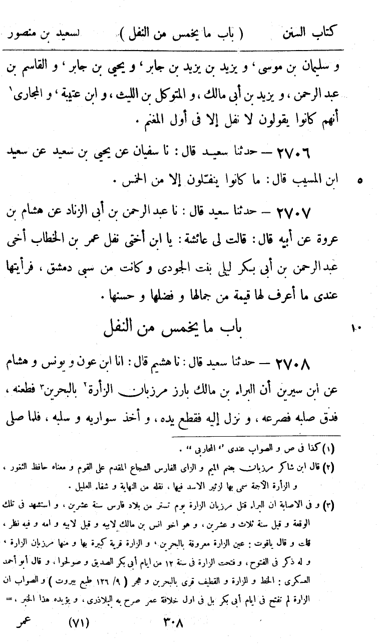 2708 - حَدَّثَنَا سَعِيدٌ قَالَ: نا هُشَيْمٌ، قَالَ: أنا ابْنُ عَوْنٍ، وَيُونُسُ، وَهِشَامٌ، عَنِ ابْنِ سِيرِينَ، أَنَّ الْبَرَاءَ بْنَ مَالِكٍ بَارَزَ مُرْزُبَانَ الزَّأْرَةِ بِالْبَحْرَيْنِ فَطَعَنَهُ، فَدَقَّ صُلْبَهُ فَصَرَعَهُ، وَنَزَلَ إِلَيْهِ فَقَطَعَ يَدَهُ، وَأَخَذَ سِوَارَيْهِ وَسَلَبَهُ، فَلَمَّا صَلَّى -[309]- عُمَرُ الظُّهْرَ أَتَى أَبَا طَلْحَةَ فِي دَارِهِ فَقَالَ: «إِنَّا §كُنَّا لَا نُخَمِّسُ السَّلَبَ، وَإِنَّ سَلَبَ الْبَرَاءِ قَدْ بَلَغَ مَالًا، فَأَنَا خَامِسُهُ، فَكَانَ أَوَّلُ سَلَبٍ خُمِّسَ فِي الْإِسْلَامِ سَلَبَ الْبَرَاءِ»
