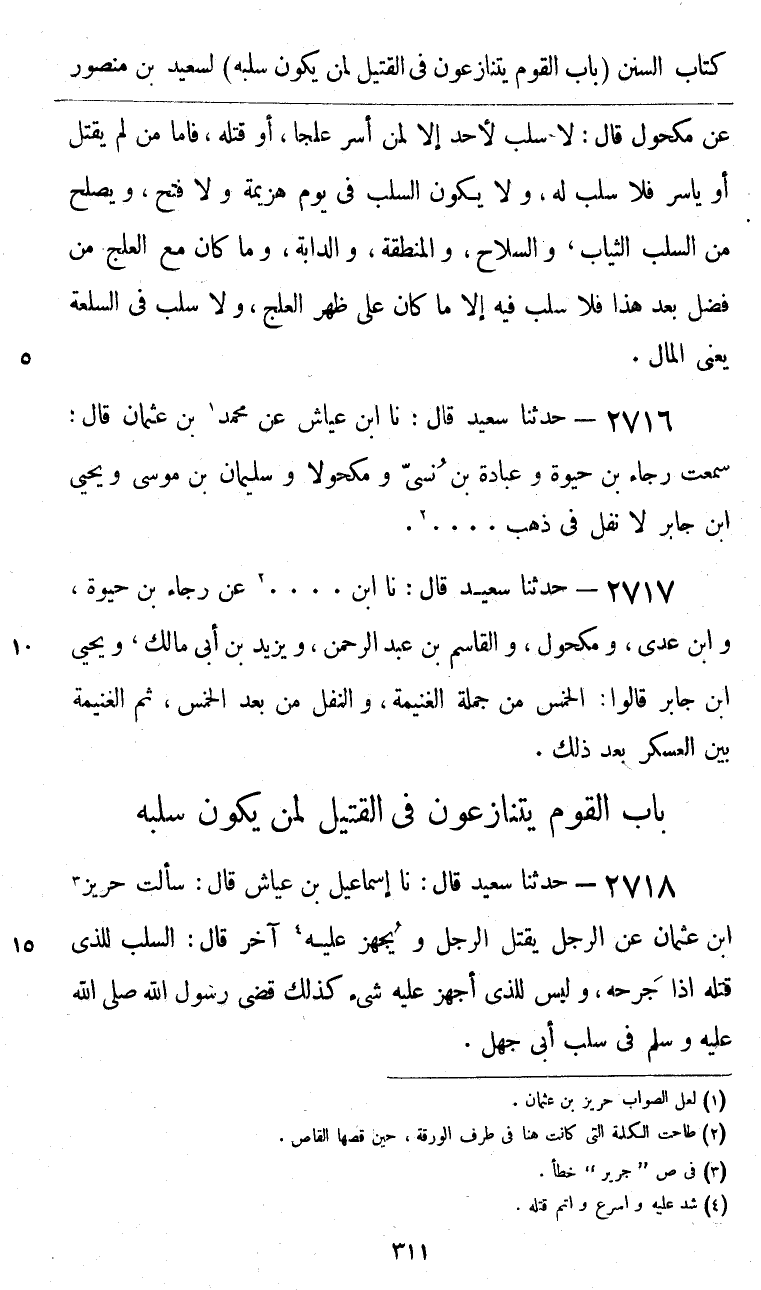 2716 - حَدَّثَنَا سَعِيدٌ قَالَ: نا ابْنُ عَيَّاشٍ، عَنْ مُحَمَّدِ بْنِ عُثْمَانَ، قَالَ: سَمِعْتُ رَجَاءَ بْنَ حَيْوَةَ، وَعُبَادَةَ بْنَ نُسِيٍّ، وَمَكْحُولًا، وَسُلَيْمَانَ بْنَ مُوسَى، وَيَحْيَى بْنَ جَابِرٍ: «§لَا نَفْلَ فِي ذَهَبٍ. . . . .»