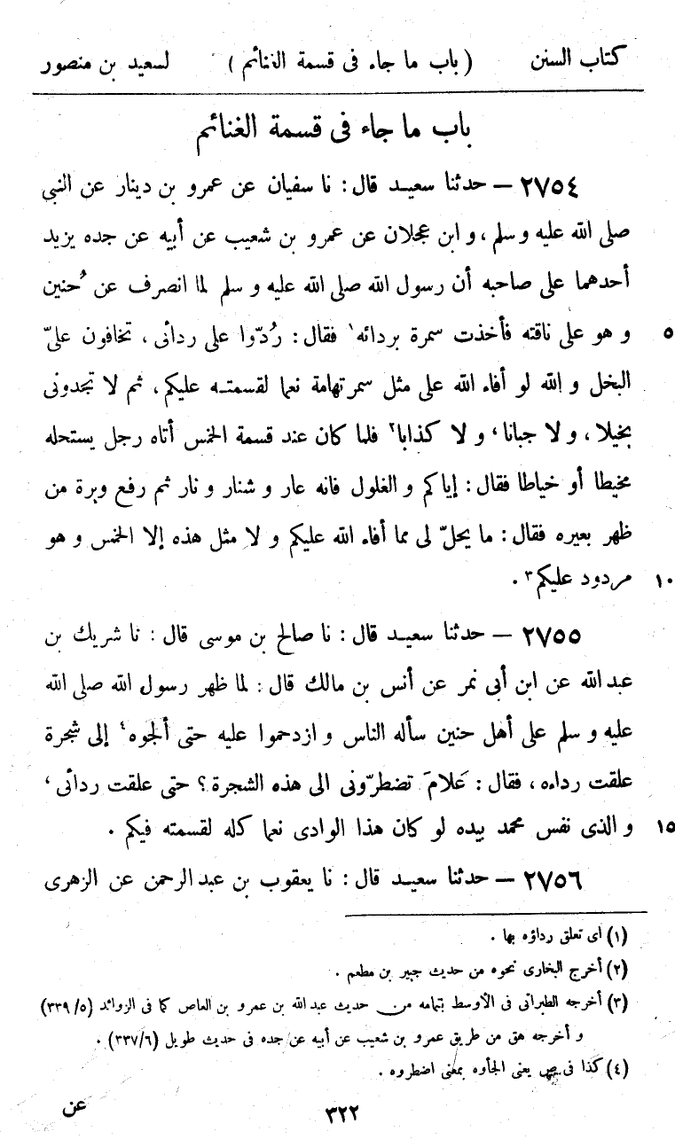2754 - حَدَّثَنَا سَعِيدٌ قَالَ: نا سُفْيَانُ، عَنْ عَمْرِو بْنِ دِينَارٍ، عَنِ النَّبِيِّ صَلَّى اللهُ عَلَيْهِ وَسَلَّمَ، وَابْنُ عَجْلَانَ عَنْ عَمْرِو بْنِ شُعَيْبٍ، عَنْ أَبِيهِ، عَنْ جَدِّهِ - يَزِيدُ أَحَدُهُمَا عَلَى صَاحِبِهِ - أَنَّ رَسُولَ اللَّهِ صَلَّى اللهُ عَلَيْهِ وَسَلَّمَ لَمَّا انْصَرَفَ عَنْ حُنَيْنٍ وَهُوَ عَلَى نَاقَتِهِ فَأَخَذَتْ سَمُرَةٌ بِرِدَائِهِ، فَقَالَ: «§رُدُّوا عَلَيَّ رِدَائِي، تَخَافُونَ عَلَيَّ الْبُخْلَ، وَاللَّهِ لَوْ أَفَاءَ اللَّهُ عَلَيَّ مِثْلَ سَمُرِ تِهَامَةَ نَعَمًا لَقَسَمْتُهُ عَلَيْكُمْ، ثُمَّ لَا تَجِدُونِي بَخِيلًا، وَلَا جَبَانًا، وَلَا كَذَّابًا» فَلَمَّا كَانَ عِنْدَ قِسْمَةِ الْخُمُسِ أَتَاهُ رَجُلٌ يَسْتَحِلُّهُ مِخْيَطًا أَوْ خِيَاطًا، فَقَالَ: «إِيَّاكُمْ وَالْغُلُولَ، فَإِنَّهُ عَارٌ وَشَنَارٌ وَنَارٌ» ، ثُمَّ رَفَعَ وَبَرَةً مِنْ ظَهْرِ بَعِيرِهِ، فَقَالَ: «مَا يَحِلُّ لِي مِمَّا أَفَاءَ اللَّهُ عَلَيْكُمْ وَلَا مِثْلُ هَذَا إِلَّا الْخُمُسُ وَهُوَ مَرْدُودٌ عَلَيْكُمْ»