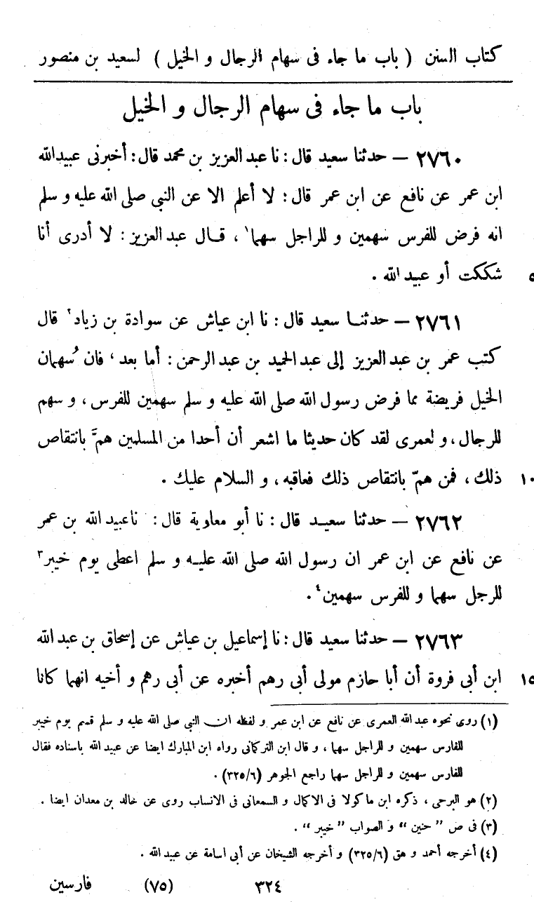 2761 - حَدَّثَنَا سَعِيدٌ قَالَ: نا ابْنُ عَيَّاشٍ، عَنْ سَوَادَةَ بْنِ زِيَادٍ، قَالَ: كَتَبَ عُمَرُ بْنُ عَبْدِ الْعَزِيزِ إِلَى عَبْدِ الْحَمِيدِ بْنِ عَبْدِ الرَّحْمَنِ: «أَمَّا بَعْدُ، فَإِنَّ §سُهْمَانَ الْخَيْلِ فَرِيضَةٌ مِمَّا فَرَضَ رَسُولُ اللَّهِ صَلَّى اللهُ عَلَيْهِ وَسَلَّمَ سَهْمَيْنِ لِلْفَرَسٍ، وَسَهْمًا لِلرِّجَالِ، وَلَعَمْرِي لَقَدْ كَانَ حَدِيثًا مَا أَشْعُرُ أَنَّ أَحَدًا مِنَ الْمُسْلِمِينَ هَمَّ بِانْتِقَاصِ ذَلِكَ، فَمَنْ هَمَّ بِانْتِقَاصِ ذَلِكَ فَعَاقِبْهُ، وَالسَّلَامُ عَلَيْكَ»