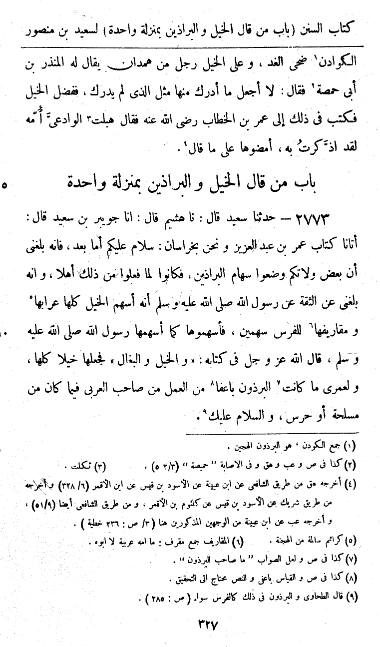 2773 - حَدَّثَنَا سَعِيدٌ قَالَ: نا هُشَيْمٌ، قَالَ: أنا جُوَيْبِرُ بْنُ سَعِيدٍ، قَالَ: أَتَانَا كِتَابُ عُمَرَ بْنِ عَبْدِ الْعَزِيزِ وَنَحْنُ بِخُرَاسَانَ: «سَلَامٌ عَلَيْكُمْ أَمَّا بَعْدُ، فَإِنَّهُ بَلَغَنِي أَنَّ بَعْضَ وُلَاتِكُمْ وَضَعُوا سِهَامَ الْبَرَاذِينِ، فَكَانُوا لِمَا فَعَلُوا مِنْ ذَلِكَ أَهْلًا، وَإِنَّهُ بَلَغَنِي عَنِ الثِّقَةِ، عَنْ رَسُولِ اللَّهِ صَلَّى اللهُ عَلَيْهِ وَسَلَّمَ أَنَّهُ» §أَسْهَمَ الْخَيْلَ كُلَّهَا عِرَابَهَا وَمَقَارِيفَهَا لِلْفَرَسِ سَهْمَيْنِ " فَأَسْهِمُوهَا كَمَا أَسْهَمَهَا رَسُولُ اللَّهِ صَلَّى اللهُ عَلَيْهِ وَسَلَّمَ، قَالَ اللَّهُ عَزَّ وَجَلَّ فِي كِتَابِهِ: {وَالْخَيْلَ وَالْبِغَالَ} [النحل: 8] فَجَعَلَهَا خَيْلًا كُلَّهَا، وَلَعَمْرِي مَا كَانَتِ الْبِرْذَوْنُ بِأَعْفَى مِنَ الْعَمَلِ مِنْ صَاحِبِ الْعَرَبِيِّ فِيمَا كَانَ مِنْ مَسْلَحَةٍ أَوْ حَرَسٍ، وَالسَّلَامُ عَلَيْكَ "