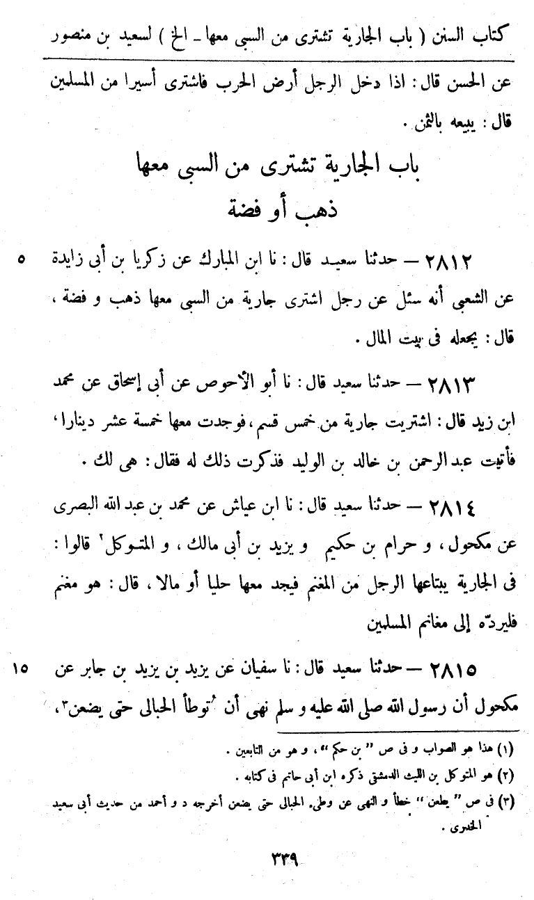 2814 - حَدَّثَنَا سَعِيدٌ قَالَ: نا ابْنُ عَيَّاشٍ، عَنْ مُحَمَّدِ بْنِ عَبْدِ اللَّهِ الْبَصْرِيِّ، عَنْ مَكْحُولٍ، وَحَرَامِ بْنِ حَكِيمٍ، وَيَزِيدَ بْنِ أَبِي مَالِكٍ، وَالْمُتَوَكِّلِ، قَالُوا فِي §الْجَارِيَةِ يَبْتَاعُهَا الرَّجُلُ مِنَ الْمَغْنَمِ، فَيَجِدُ مَعَهَا حُلِيًّا أَوْ مَالًا قَالَ: «هُوَ مَغْنَمٌ، فَلْيَرُدَّهُ إِلَى مَغَانِمِ الْمُسْلِمِينَ»
