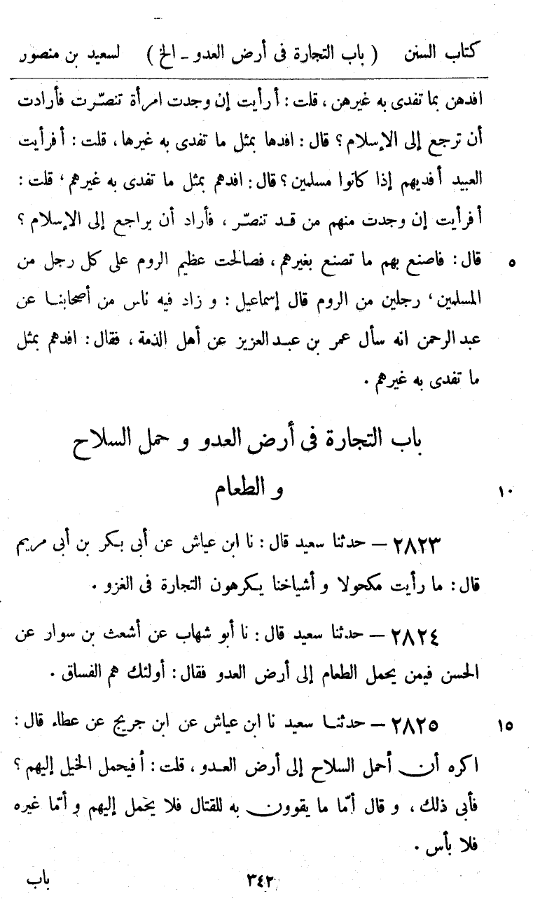 2823 - حَدَّثَنَا سَعِيدٌ قَالَ: نا ابْنُ عَيَّاشٍ، عَنْ أَبِي بَكْرِ بْنِ أَبِي مَرْيَمَ، قَالَ: «§مَا رَأَيْتُ مَكْحُولًا وَأَشْيَاخَنَا يَكْرَهُونَ التِّجَارَةَ فِي الْغَزْوِ»
