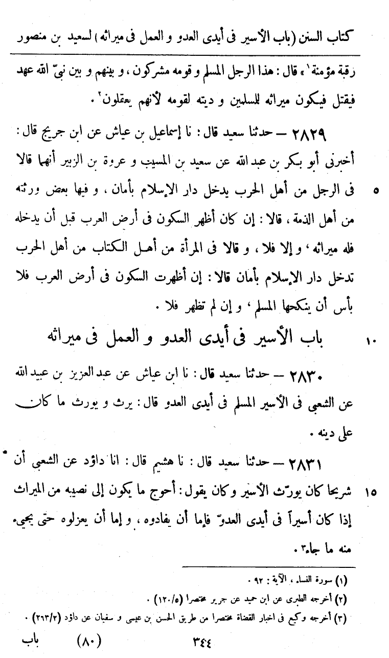 2830 - حَدَّثَنَا سَعِيدٌ قَالَ: نا ابْنُ عَيَّاشٍ، عَنْ عَبْدِ الْعَزِيزِ بْنِ عُبَيْدِ اللَّهِ، عَنِ الشَّعْبِيِّ، فِي §الْأَسِيرِ الْمُسْلِمِ فِي أَيْدِي الْعَدُوِّ قَالَ: «يَرِثُ وَيُوَرَّثُ مَا كَانَ عَلَى دِينِهِ»