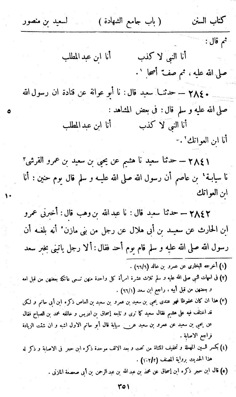 2840 - حَدَّثَنَا سَعِيدٌ قَالَ: نا أَبُو عَوَانَةَ، عَنْ قَتَادَةَ، أَنَّ رَسُولَ اللَّهِ صَلَّى اللهُ عَلَيْهِ وَسَلَّمَ قَالَ فِي بَعْضِ الْمَشَاهِدِ: «§أَنَا النَّبِيُّ لَا كَذِبَ، أَنَا ابْنُ عَبْدِ الْمُطَّلِبِ أَنَا ابْنُ الْعَوَاتِكِ»