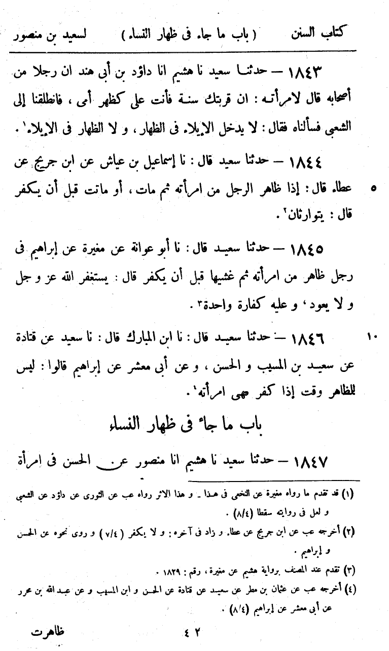 1847 - حَدَّثَنَا سَعِيدٌ، نا هُشَيْمٌ، أنا مَنْصُورٌ، عَنِ الْحَسَنِ، فِي §امْرَأَةٍ -[43]- ظَاهَرَتْ مِنْ زَوْجِهَا قَالَ: «لَيْسَ بِشَيْءٍ، إِنَّمَا الظِّهَارُ لِلرِّجَالِ»