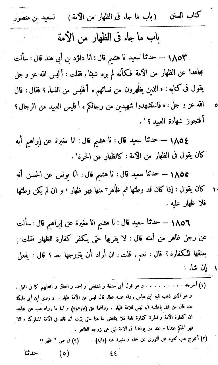 1853 - حَدَّثَنَا سَعِيدٌ، نا هُشَيْمٌ، قَالَ: أنا دَاوُدُ بْنُ أَبِي هِنْدَ، قَالَ: سَأَلْتُ مُجَاهِدًا عَنِ §الظِّهَارِ مِنَ الْأَمَةِ فَكَأَنَّهُ لَمْ يَرَهُ شَيْئًا، فَقُلْتُ: أَلَيْسَ اللَّهُ عَزَّ وَجَلَّ يَقُولُ فِي كِتَابِهِ: {الَّذِينَ يُظَاهِرُونَ مِنْ نِسَائِهِمْ} [المجادلة: 3] أَفَلَيْسَ مِنَ النِّسَاءِ؟ فَقَالَ: قَالَ اللَّهُ عَزَّ وَجَلَّ: {وَاسْتَشْهِدُوا شَهِيدَيْنِ مِنْ رِجَالِكُمْ} [البقرة: 282] أَفَلَيْسَ الْعَبِيدُ مِنَ الرِّجَالِ؟ «أَفَتَجُوزُ شَهَادَةُ الْعَبِيدِ؟»