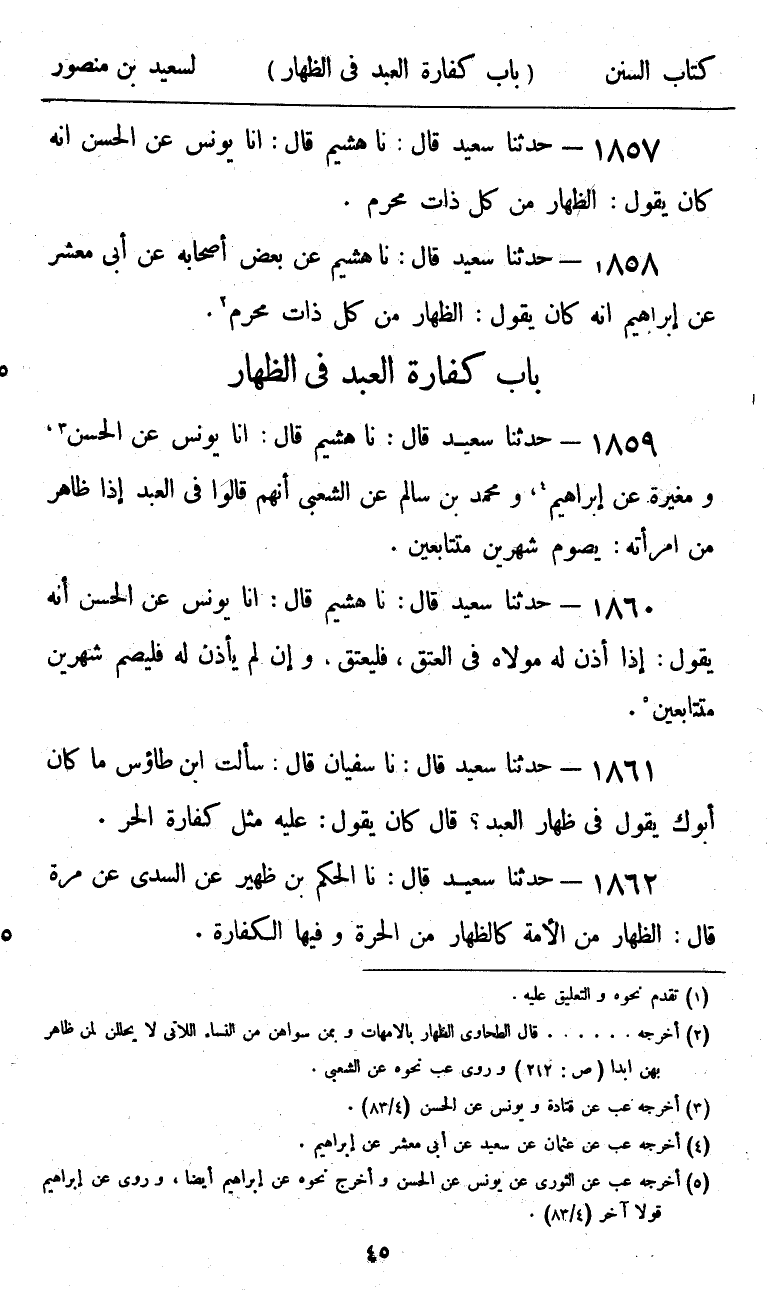1857 - حَدَّثَنَا سَعِيدٌ قَالَ: نا هُشَيْمٌ، قَالَ: أنا يُونُسُ، عَنِ الْحَسَنِ، أَنَّهُ كَانَ يَقُولُ: «§الظِّهَارُ مِنْ كُلِّ ذَاتِ مَحْرَمٍ»