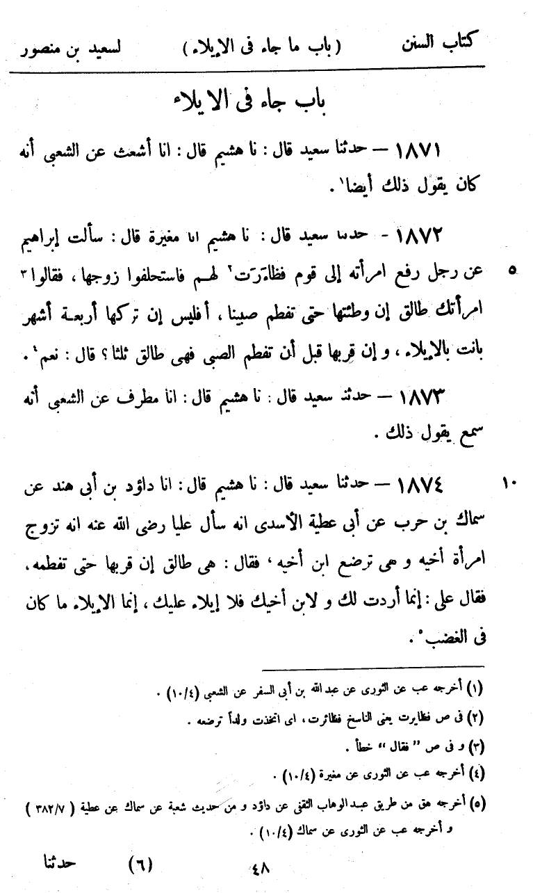 1872 - حَدَّثَنَا سَعِيدٌ قَالَ: نا هُشَيْمٌ، أنا مُغِيرَةُ، قَالَ: سَأَلْتُ إِبْرَاهِيمَ عَنْ §رَجُلٍ رَفَعَ امْرَأَتَهُ إِلَى قَوْمٍ فَظَاءَرَتْ لَهُمْ فَاسْتَحْلَفُوا زَوْجَهَا، فَقَالُوا: امْرَأَتُكَ طَالِقٌ إِنْ وَطِئْتَهَا حَتَّى تَفْطِمَ صَبِيَّنَا، أَفَلَيْسَ إِنْ تَرَكَهَا أَرْبَعَةَ أَشْهُرٍ بَانَتْ بِالْإِيلَاءِ، وَإِنْ قَرَبَهَا قَبْلَ أَنْ تَفْطِمَ الصَّبِيَّ فَهِيَ طَالِقٌ ثَلَاثًا؟ قَالَ: «نَعَمْ»