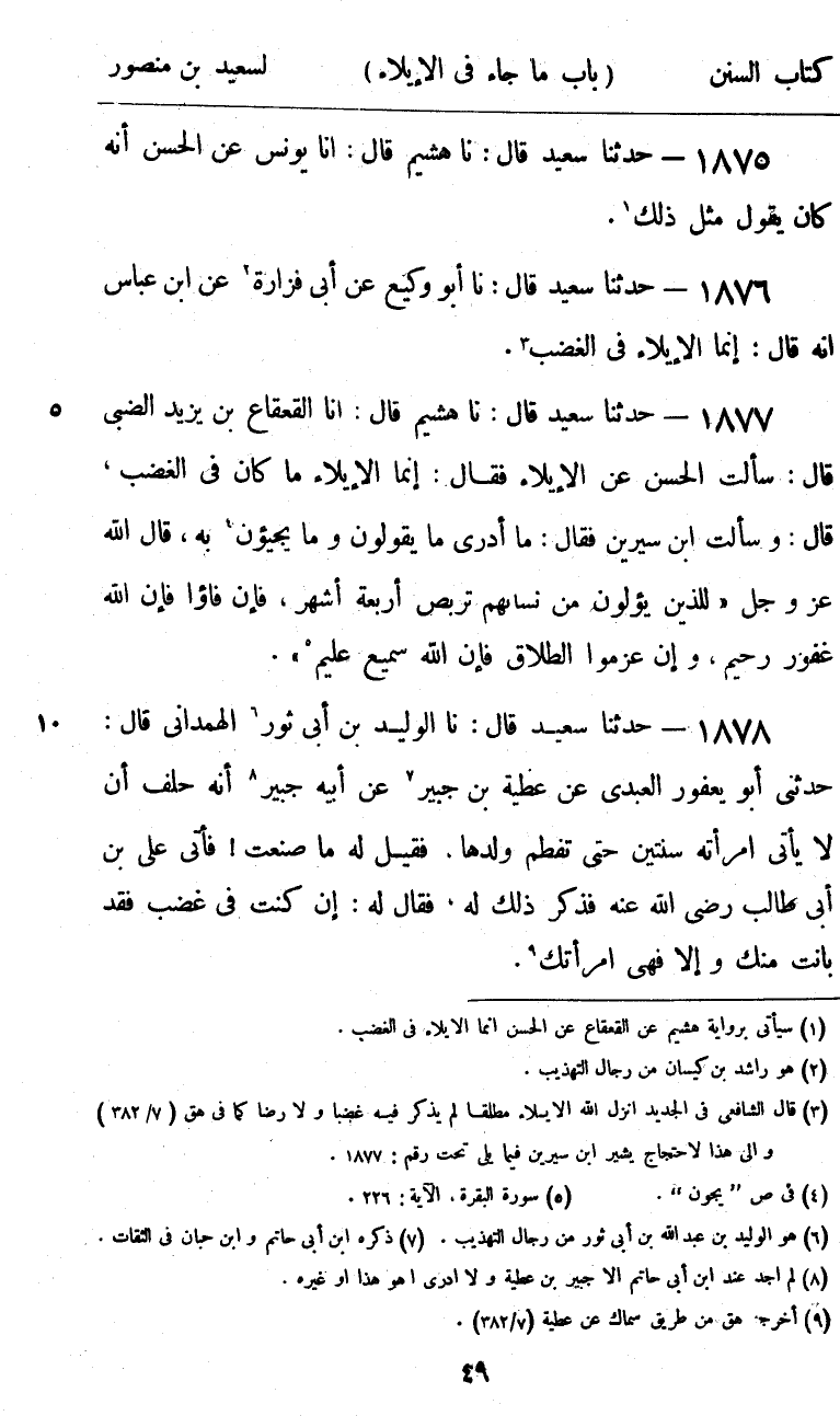 1877 - حَدَّثَنَا سَعِيدٌ قَالَ: نا هُشَيْمٌ، قَالَ: أنا الْقَعْقَاعُ بْنُ يَزِيدَ الضَّبِّيُّ، قَالَ: سَأَلْتُ الْحَسَنَ عَنِ الْإِيلَاءِ، فَقَالَ: «إِنَّمَا §الْإِيلَاءُ مَا كَانَ فِي الْغَضَبِ» قَالَ: وَسَأَلْتُ ابْنَ سِيرِينَ فَقَالَ: " مَا أَدْرِي مَا يَقُولُونَ، وَمَا يَجِيئُونَ بِهِ، قَالَ اللَّهُ عَزَّ وَجَلَّ {لِلَّذِينَ يُؤْلُونَ مِنْ نِسَائِهِمْ تَرَبُّصُ أَرْبَعَةِ أَشْهُرٍ فَإِنْ فَاءُوا فَإِنَّ اللَّهَ غَفُورٌ رَحِيمٌ وَإِنْ عَزَمُوا الطَّلَاقَ فَإِنَّ اللَّهَ سَمِيعٌ عَلِيمٌ}
