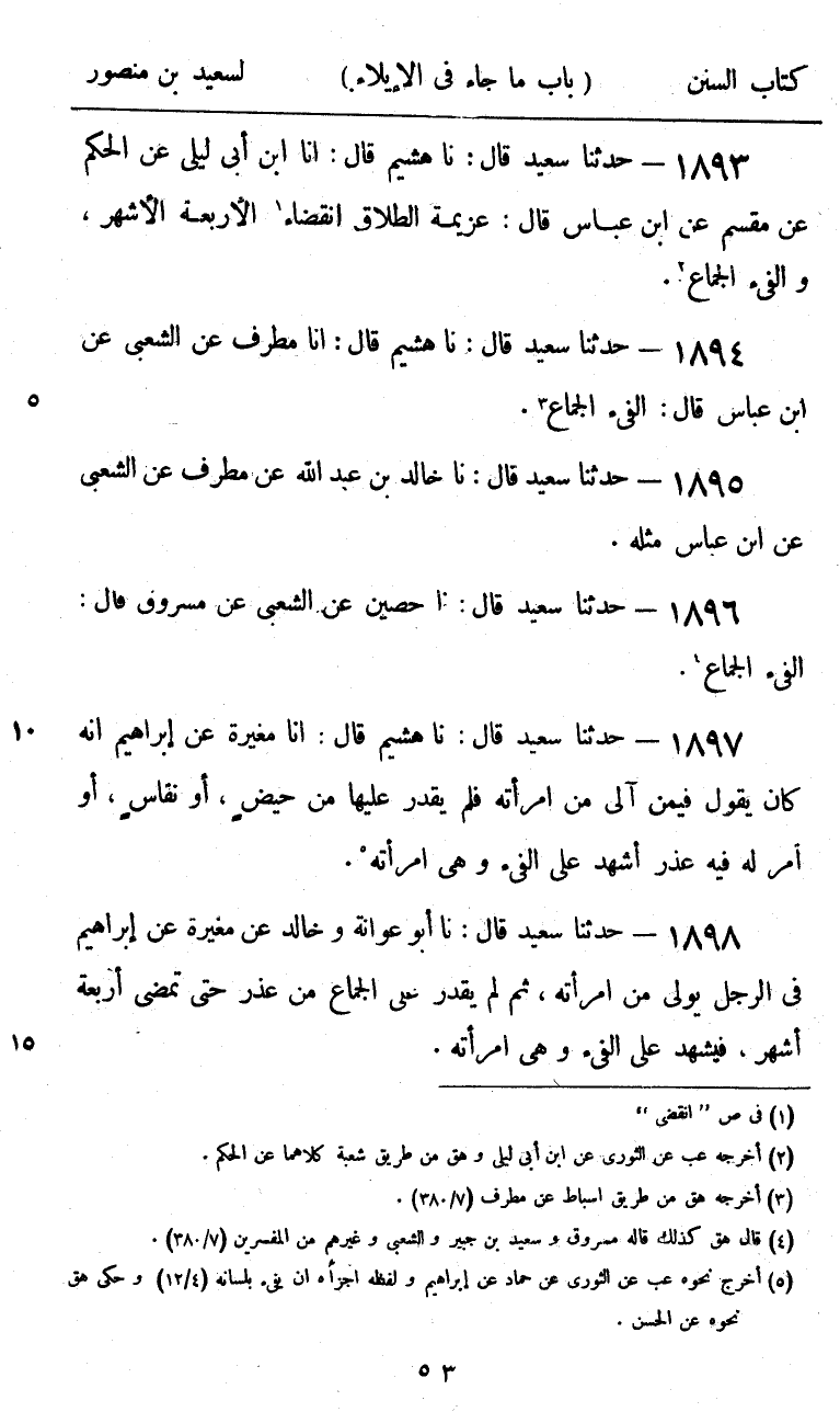 1897 - حَدَّثَنَا سَعِيدٌ قَالَ: نا هُشَيْمٌ، قَالَ: أنا مُغِيرَةُ، عَنْ إِبْرَاهِيمَ، أَنَّهُ كَانَ يَقُولُ فِيمَنْ §آلَى مِنِ امْرَأَتِهِ فَلَمْ يَقْدِرْ عَلَيْهَا مِنْ حَيْضٍ، أَوْ نِفَاسٍ، أَوْ أَمْرٍ لَهُ فِيهِ عُذْرٌ: «أَشْهَدُ عَلَى الْفَيْءِ، وَهِيَ امْرَأَتُهُ»