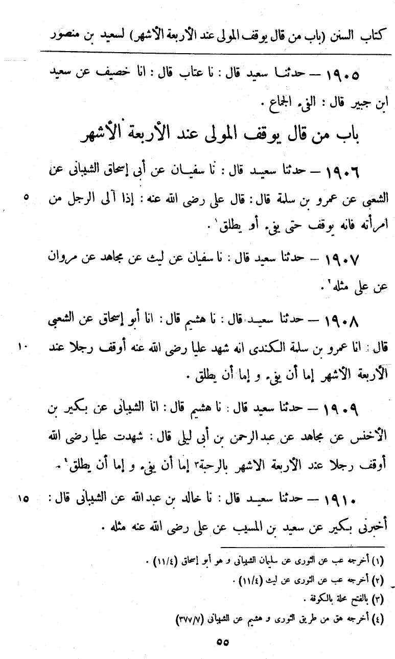 1908 - حَدَّثَنَا سَعِيدٌ قَالَ: نا هُشَيْمٌ، قَالَ: أنا أَبُو إِسْحَاقَ، عَنِ الشَّعْبِيِّ، قَالَ: أنا عَمْرُو بْنُ سَلَمَةَ الْكِنْدِيُّ، «أَنَّهُ شَهِدَ عَلِيًّا رَضِيَ اللَّهُ عَنْهُ §أَوْقَفَ رَجُلًا عِنْدَ الْأَرْبَعَةِ الْأَشْهُرِ، إِمَّا أَنْ يَفِيءَ، وَإِمَّا أَنْ يُطَلِّقَ»