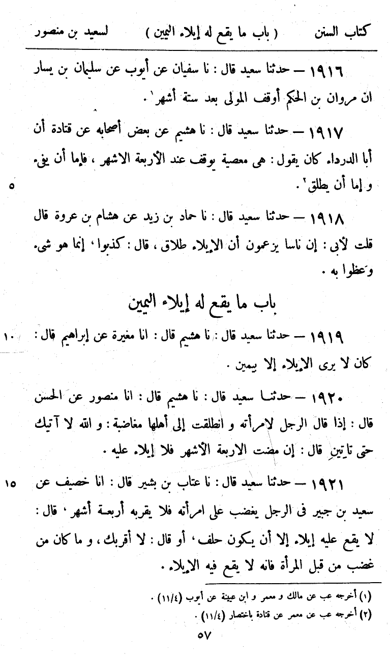 1919 - حَدَّثَنَا سَعِيدٌ قَالَ: نا هُشَيْمٌ، قَالَ: أنا مُغِيرَةُ، عَنْ إِبْرَاهِيمَ، قَالَ: «كَانَ §لَا يَرَى الْإِيلَاءَ إِلَّا بِيَمِينٍ»