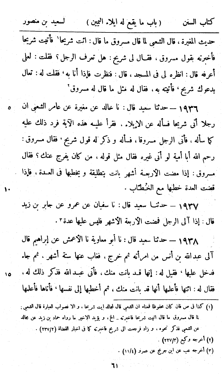 1937 - حَدَّثَنَا سَعِيدٌ قَالَ: نا سُفْيَانُ، عَنْ عَمْرٍو، عَنْ جَابِرِ بْنِ زَيْدٍ، قَالَ: «§إِذَا آلَى الرَّجُلُ فَمَضَتِ الْأَرْبَعَةُ الْأَشْهُرِ فَلَيْسَ عَلَيْهَا عِدَّةٌ»