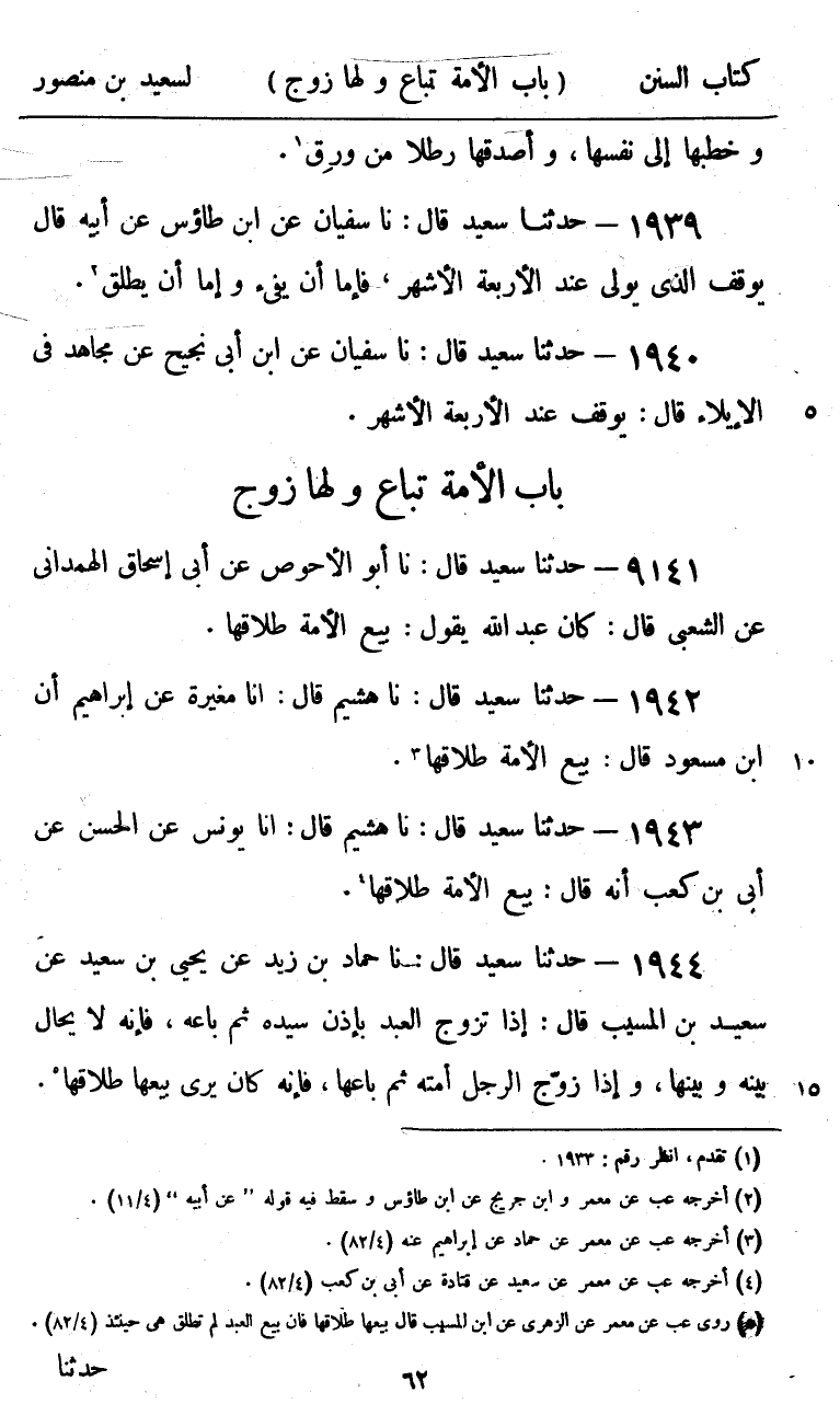 1941 - حَدَّثَنَا سَعِيدٌ قَالَ: نا أَبُو الْأَحْوَصِ، عَنْ أَبِي إِسْحَاقَ الْهَمْدَانِيِّ، عَنِ الشَّعْبِيِّ، قَالَ: كَانَ عَبْدُ اللَّهِ يَقُولُ: «§بَيْعُ الْأَمَةِ طَلَاقُهَا»