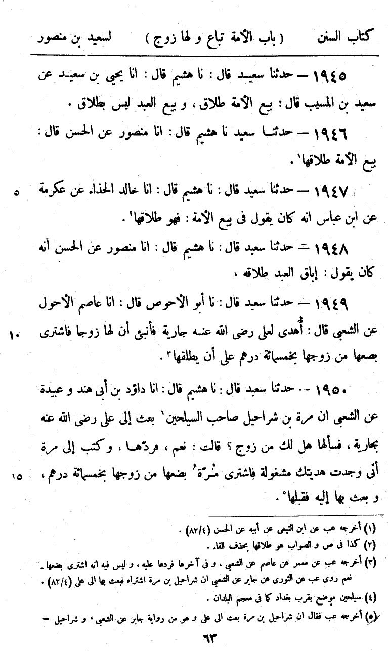 1945 - حَدَّثَنَا سَعِيدٌ قَالَ: نا هُشَيْمٌ، قَالَ: أنا يَحْيَى بْنُ سَعِيدٍ، عَنْ سَعِيدِ بْنِ الْمُسَيِّبِ، قَالَ: «§بَيْعُ الْأَمَةِ طَلَاقٌ، وَبَيْعُ الْعَبْدِ لَيْسَ بِطَلَاقٍ»