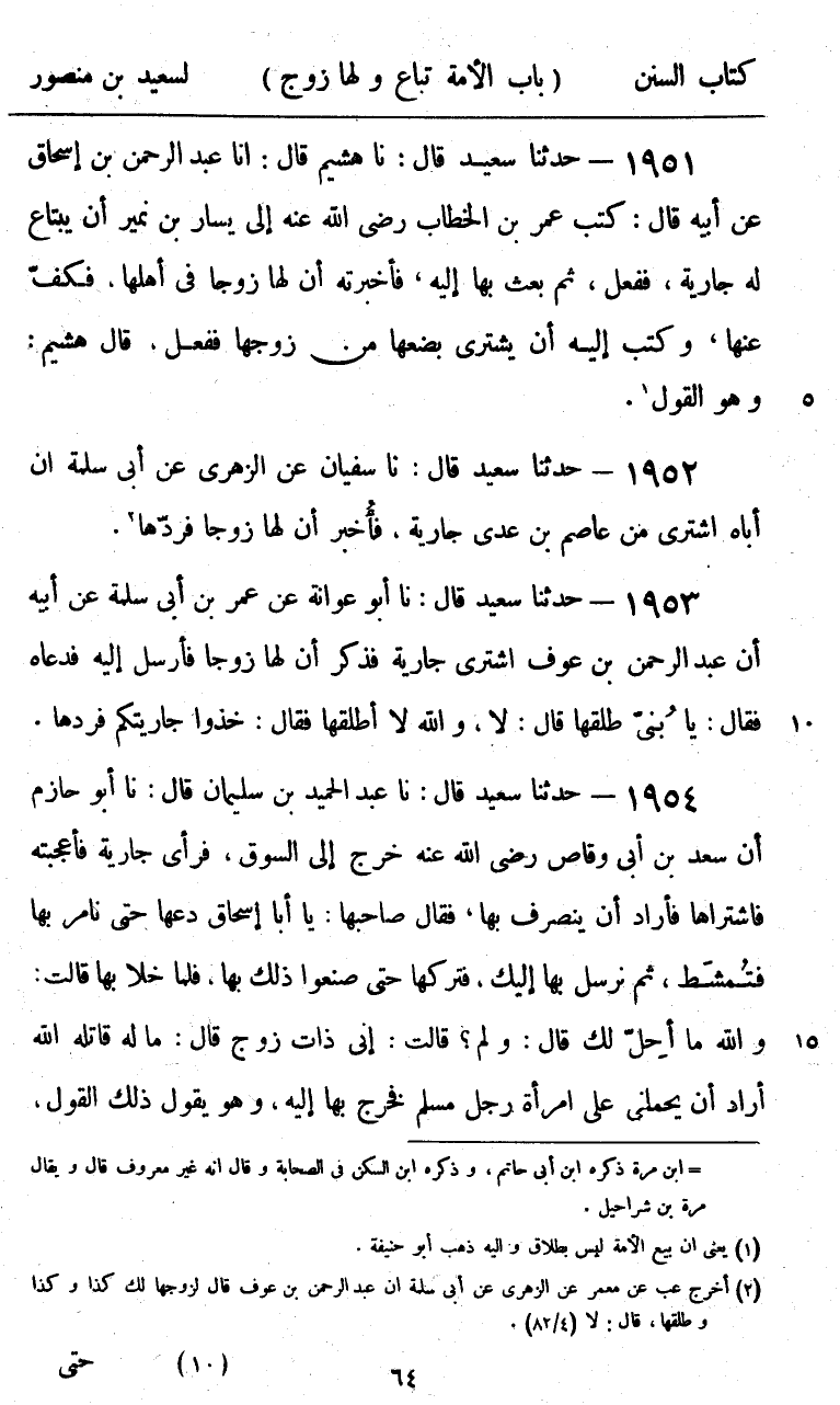 1951 - حَدَّثَنَا سَعِيدٌ قَالَ: نا هُشَيْمٌ، قَالَ: أنا عَبْدُ الرَّحْمَنِ بْنُ إِسْحَاقَ، عَنْ أَبِيهِ، قَالَ: كَتَبَ عُمَرُ بْنُ الْخَطَّابِ رَضِيَ اللَّهُ عَنْهُ إِلَى يَسَارِ بْنِ نُمَيْرٍ أَنْ يَبْتَاعَ، لَهُ جَارِيَةً، فَفَعَلَ، ثُمَّ بَعَثَ بِهَا إِلَيْهِ، فَأَخْبَرَتْهُ أَنَّ لَهَا زَوْجًا فِي أَهْلِهَا، فَكَفَّ عَنْهَا، §وَكَتَبَ إِلَيْهِ: أَنْ يَشْتَرِيَ بُضْعَهَا مِنْ زَوْجِهَا فَفَعَلَ " قَالَ هُشَيْمٌ: وَهُوَ الْقَوْلُ