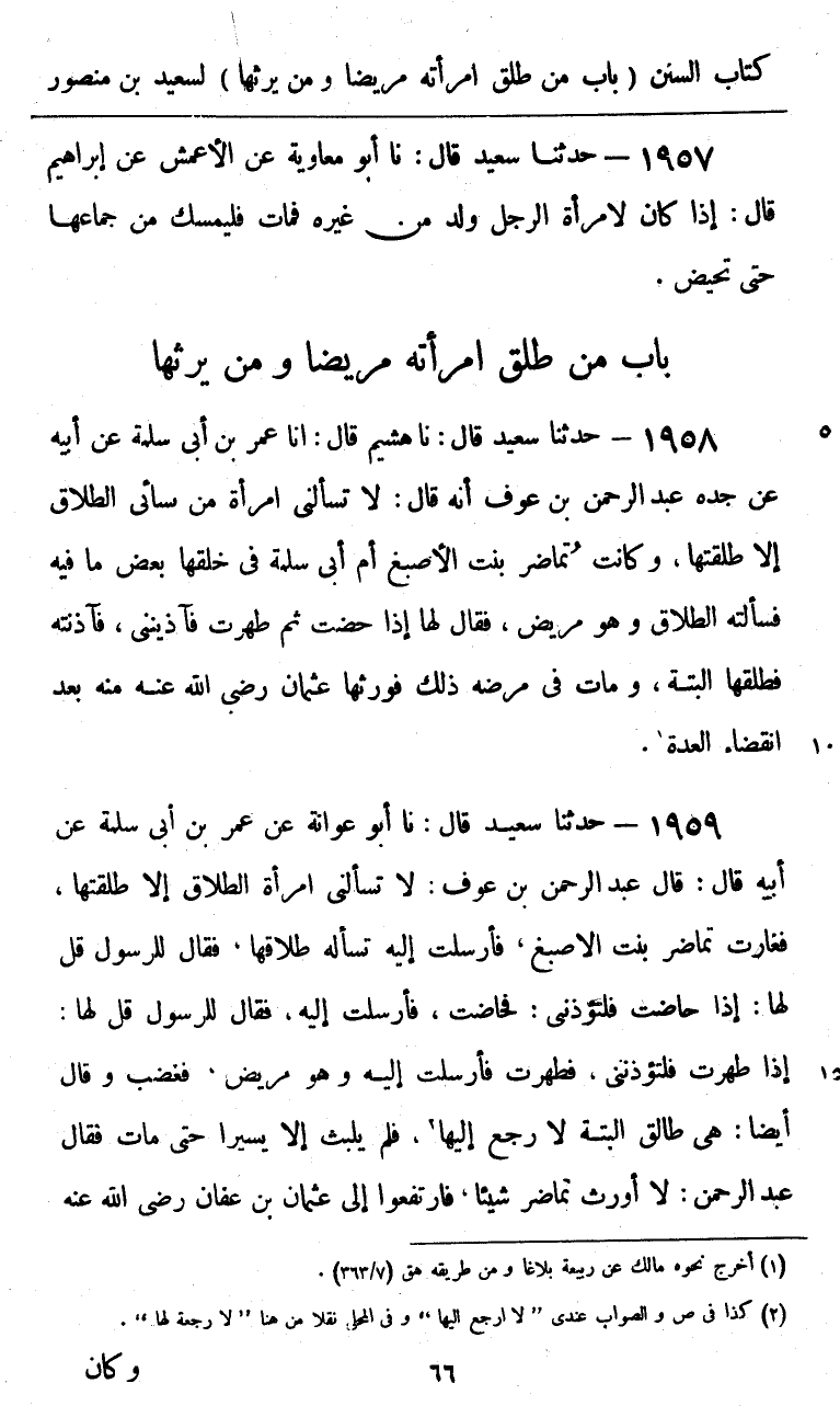 1959 - حَدَّثَنَا سَعِيدٌ قَالَ: نا أَبُو عَوَانَةَ، عَنْ عُمَرَ بْنِ أَبِي سَلَمَةَ، عَنْ أَبِيهِ، قَالَ: قَالَ عَبْدُ الرَّحْمَنِ بْنُ عَوْفٍ: " §لَا تَسْأَلُنِي امْرَأَةٌ الطَّلَاقَ إِلَّا طَلَّقْتُهَا، فَغَارَتْ تُمَاضِرُ بِنْتُ الْأَصْبَغِ، فَأَرْسَلَتْ إِلَيْهِ تَسْأَلُهُ طَلَاقَهَا، فَقَالَ لِلرَّسُولِ: قُلْ لَهَا: «إِذَا حَاضَتْ فَلْتُؤْذِنِّي» فَحَاضَتْ، فَأَرْسَلَتْ إِلَيْهِ فَقَالَ لِلرَّسُولِ قُلْ لَهَا: إِذَا طَهُرْتِ فَلْتُؤْذِنَنِي، فَطَهُرَتْ، فَأَرْسَلَتْ إِلَيْهِ وَهُوَ مَرِيضٌ، فَغَضِبَ، وَقَالَ أَيْضًا: «هِيَ طَالِقٌ الْبَتَّةَ لَا رَجْعَ إِلَيْهَا» فَلَمْ يَلْبَثْ إِلَّا يَسِيرًا حَتَّى مَاتَ، فَقَالَ عَبْدُ الرَّحْمَنِ: لَا أُوَرِّثُ تُمَاضِرَ شَيْئًا، فَارْتَفَعُوا إِلَى عُثْمَانَ بْنِ عَفَّانَ رَضِيَ اللَّهُ عَنْهُ -[67]-، وَكَانَ ذَلِكَ فِي الْعِدَّةِ فَوَرَّثَهَا مِنْهُ، فَصَالَحُوهَا مِنْ نَصِيبِهَا رُبُعَ الثَّمَنِ عَلَى ثَمَانِينَ أَلْفًا فَمَا أَوْفَوْهَا